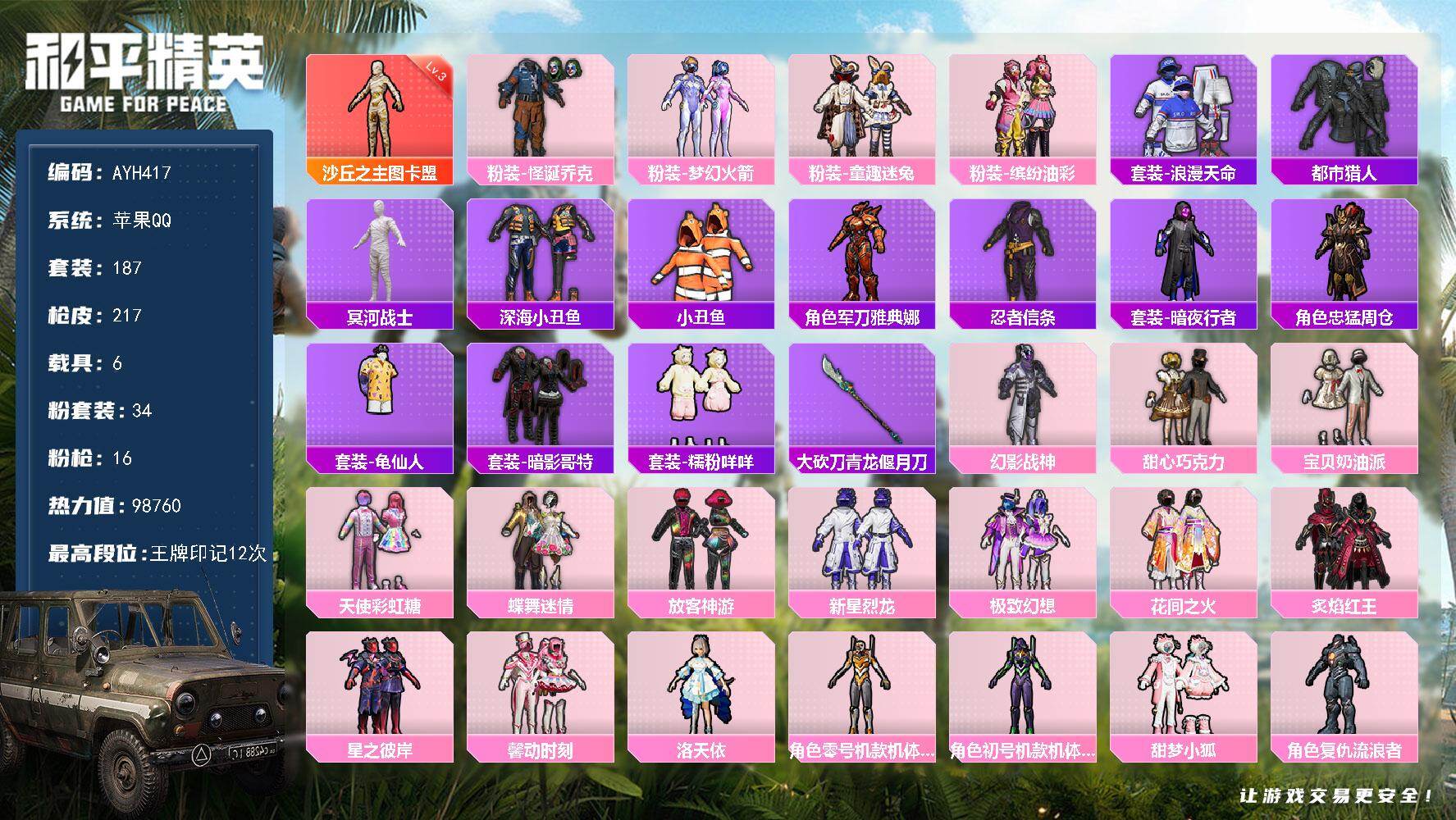 1神装-34粉装-16特效枪-6载具-10粉色飞行器-98760热力值-12王牌印记-187套装-217枪皮