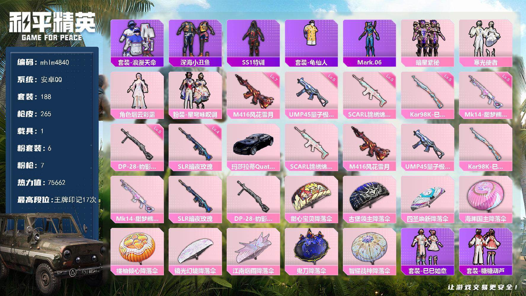 安卓 手Q-6粉装-7特效枪-1载具-0粉色飞行器-75662热力值-17王牌印