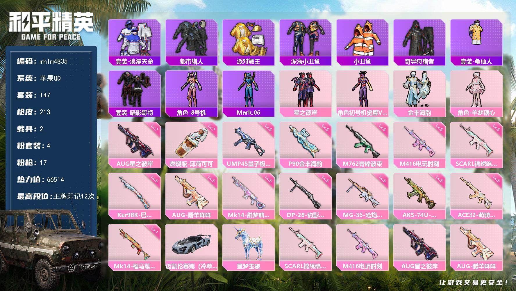 4粉装-17特效枪-2载具-4粉色飞行器-66514热力值-12王牌印记-147套装-213枪皮