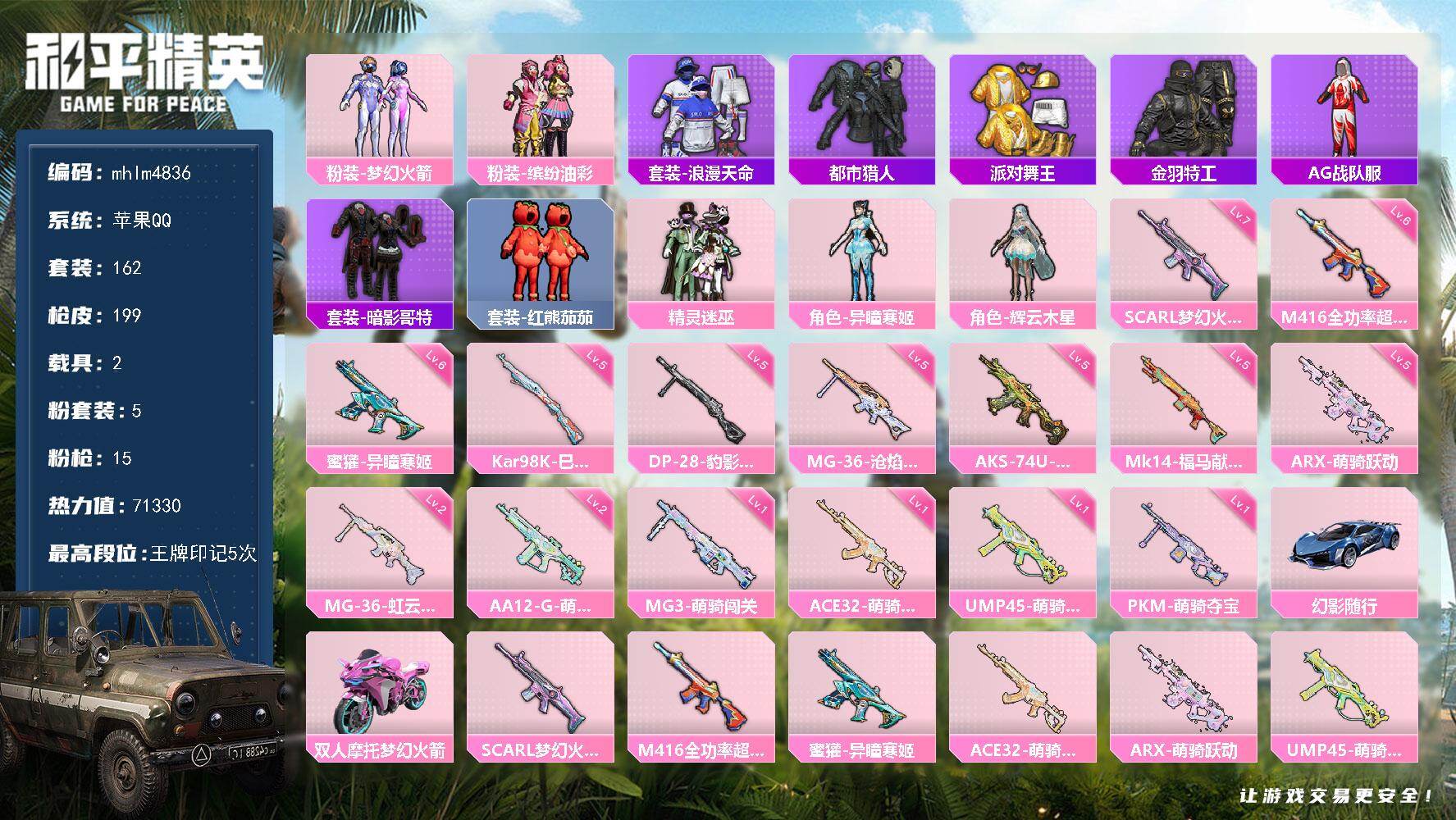 苹果 手Q-5粉装-15特效枪-2载具-4粉色飞行器-71330热力值-5王牌印