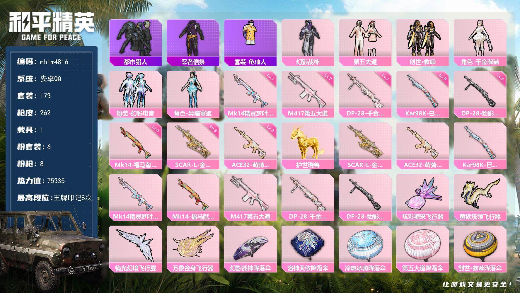 安卓 手Q-2粉装-9特效枪-0载具-1粉色飞行器-56660热力值-7王牌印