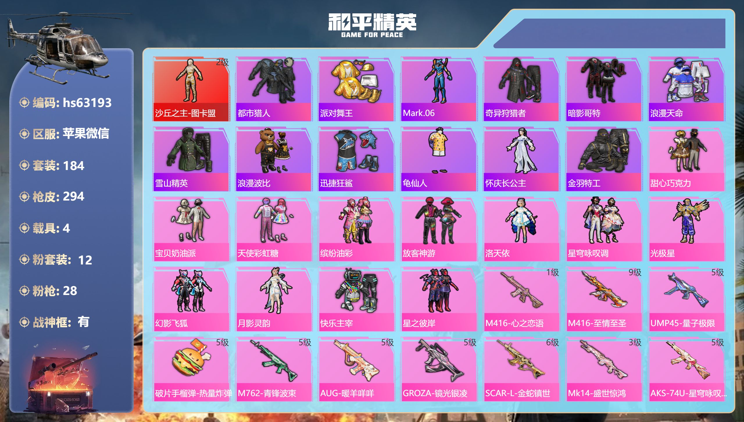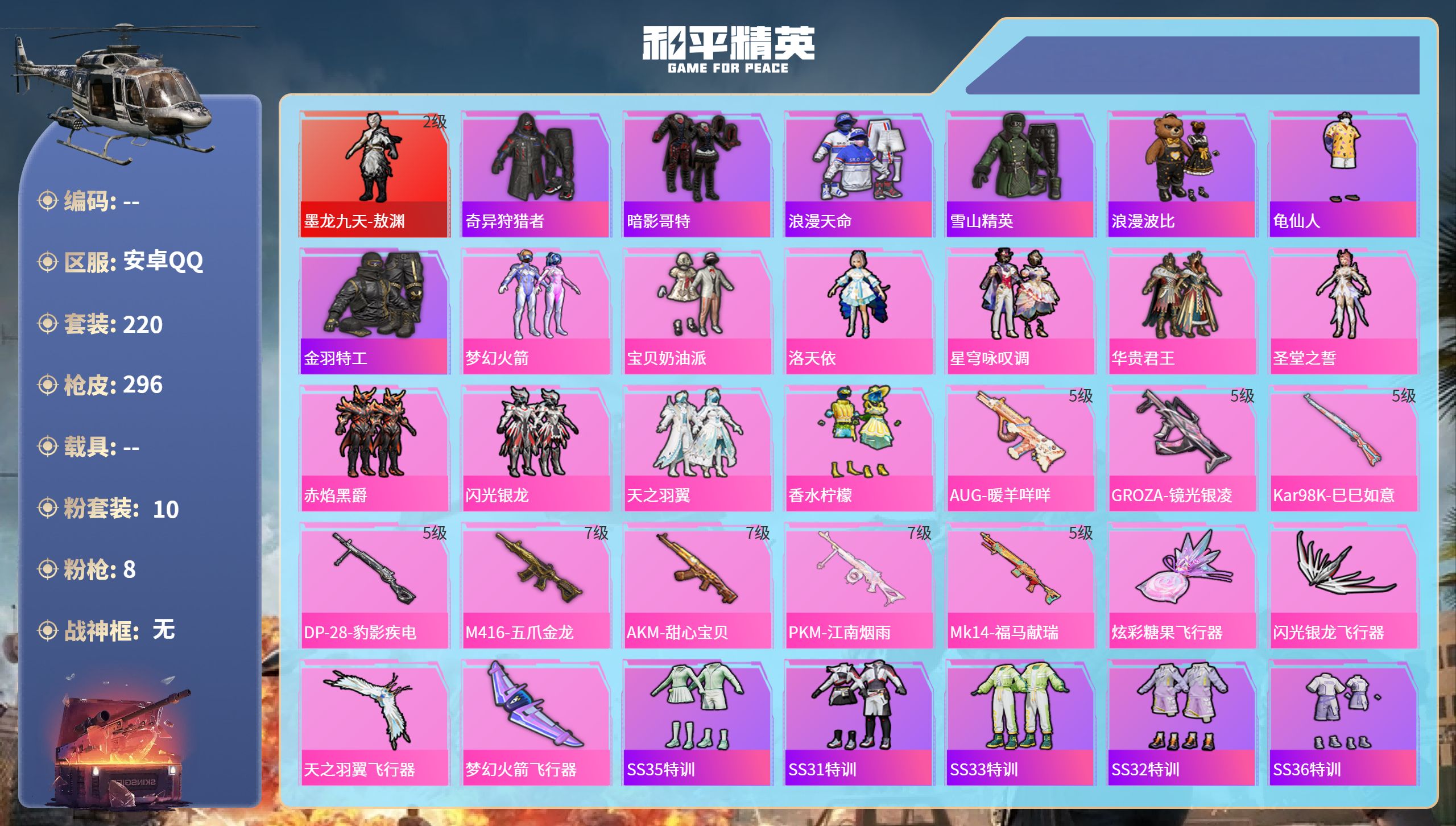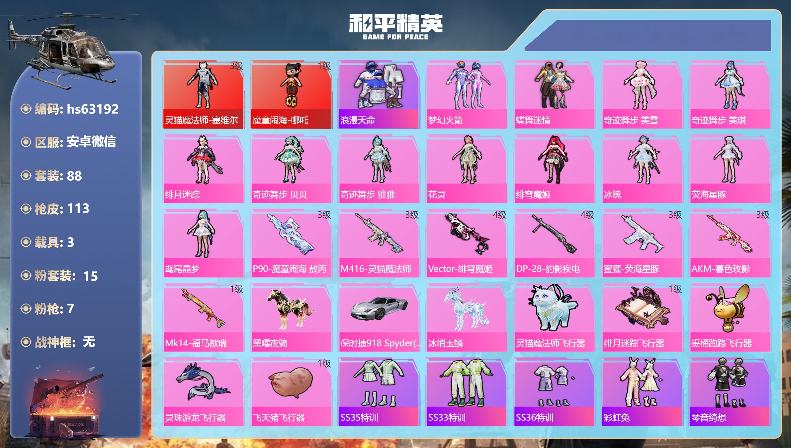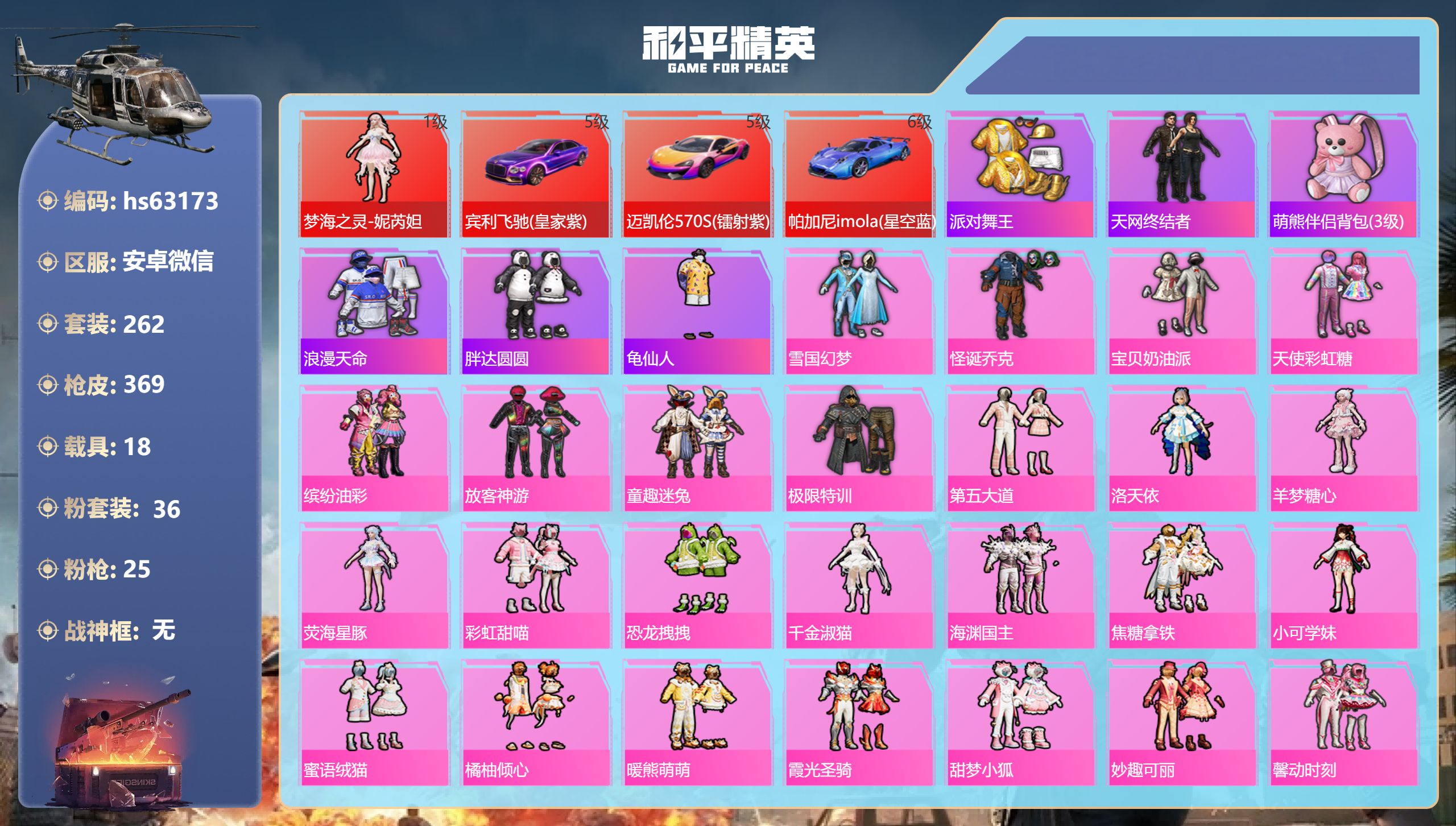 安卓微信-14王牌印记-1红装-36粉装-25特效枪-18载具-