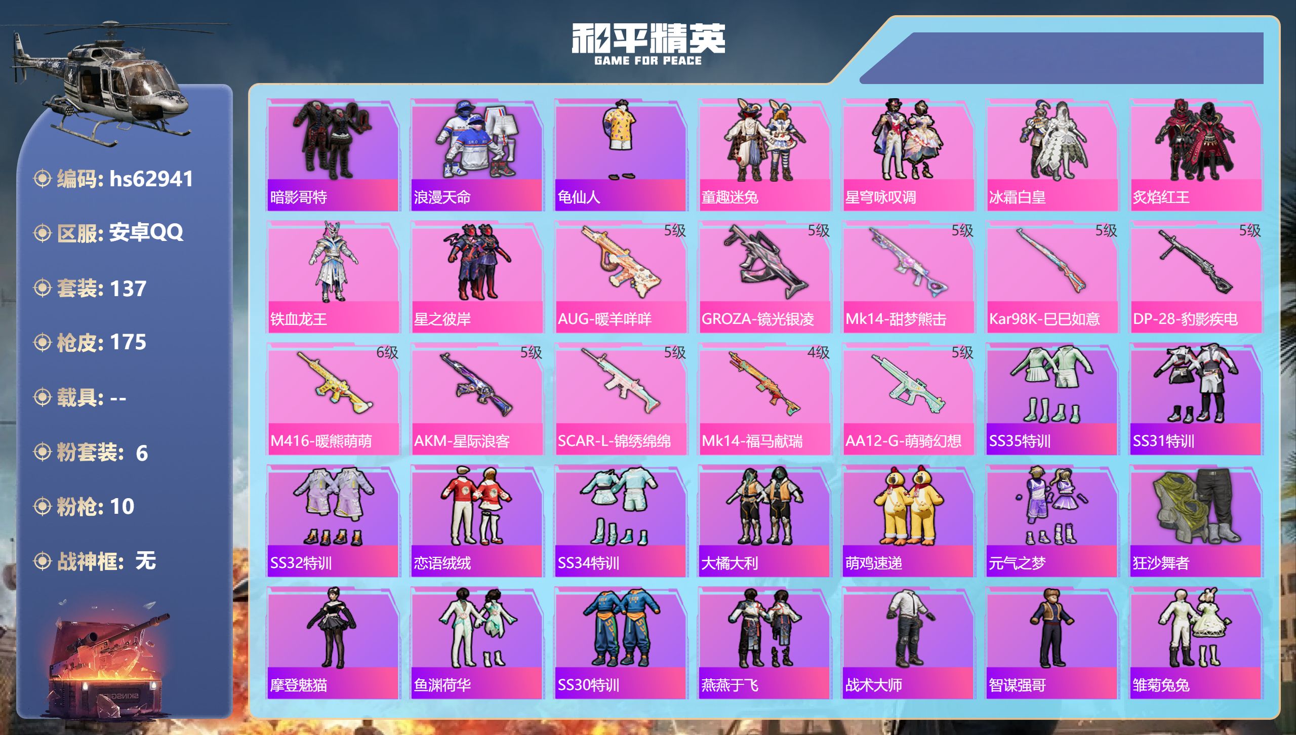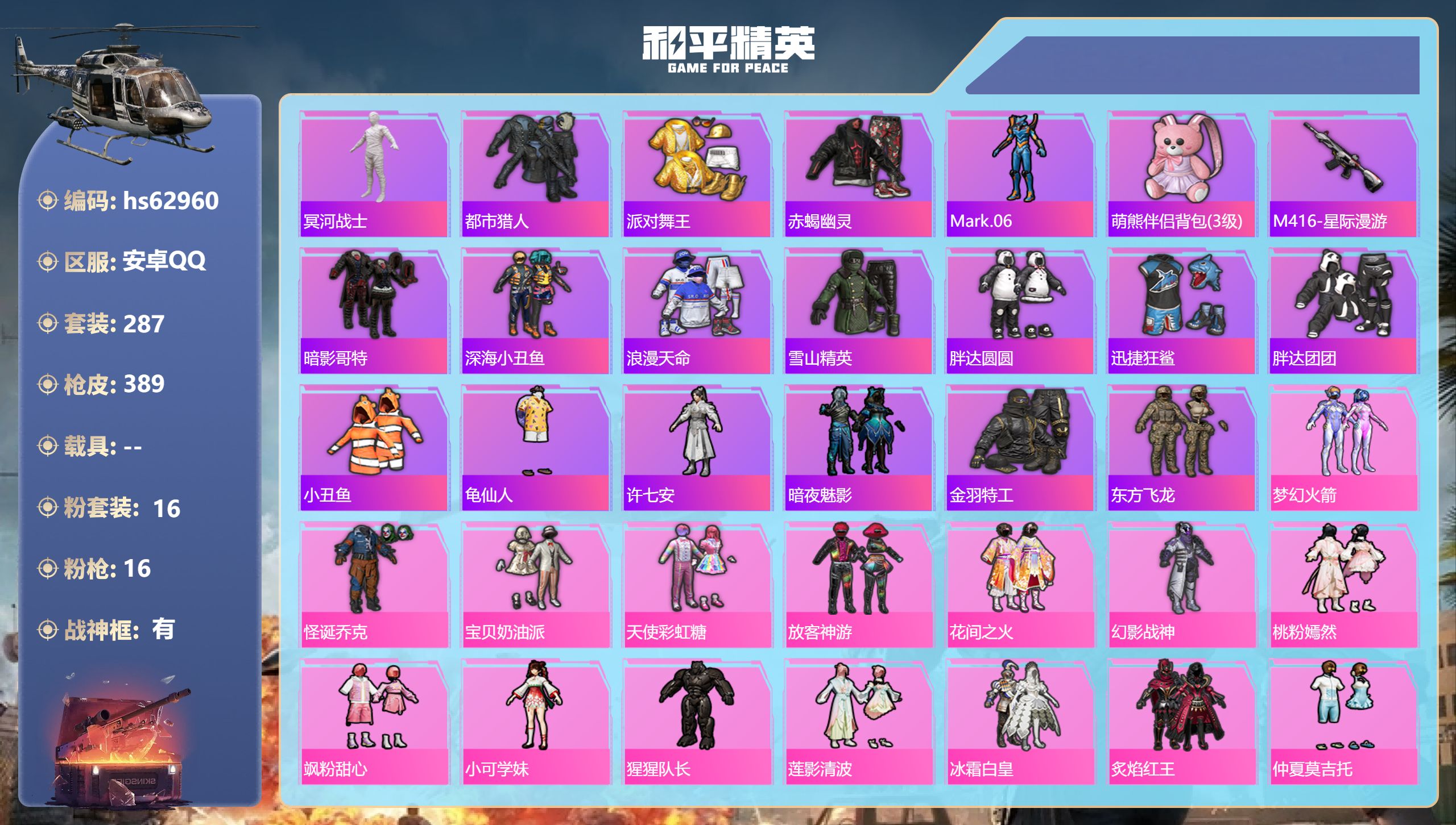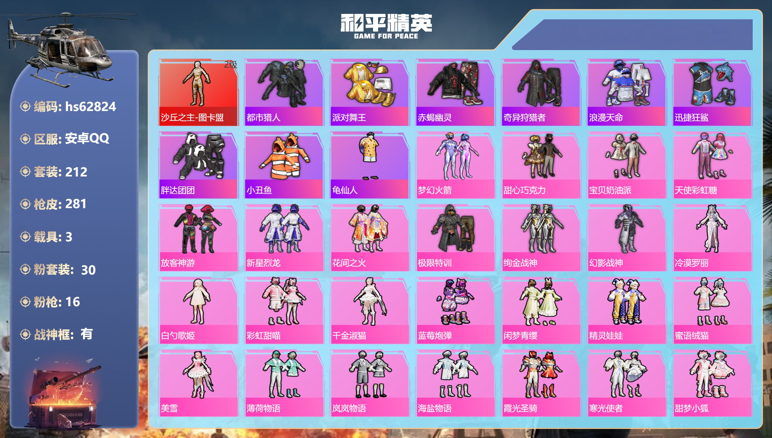 安卓手Q-24王牌印记-有战神框-16粉装-16特效枪-热力值-