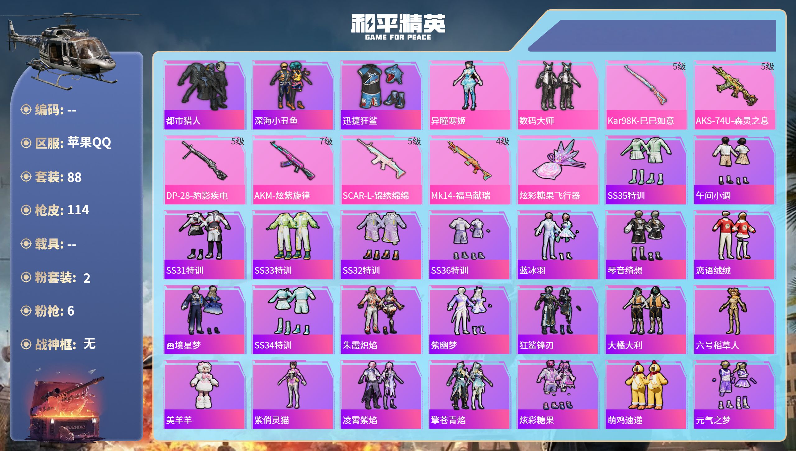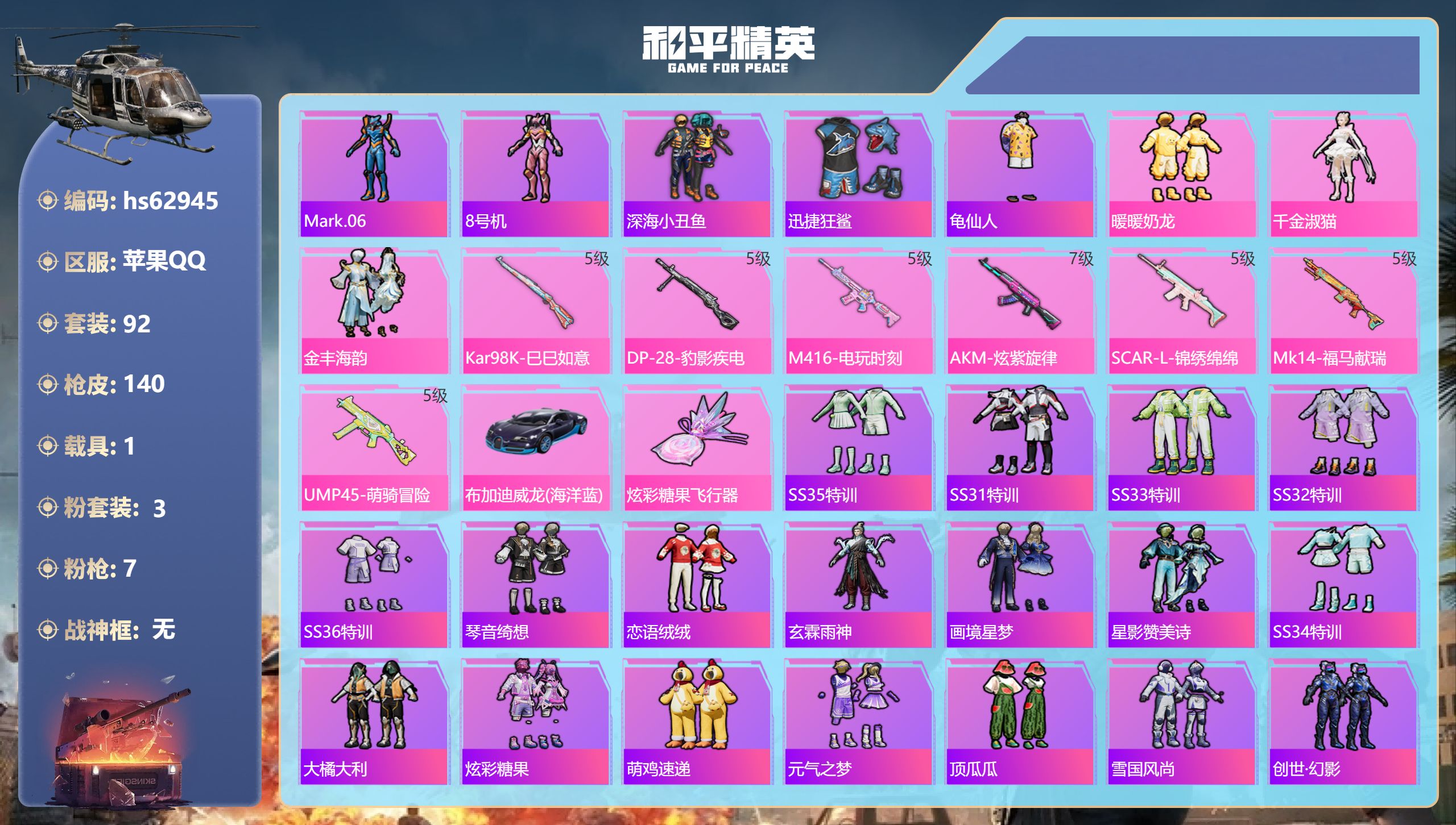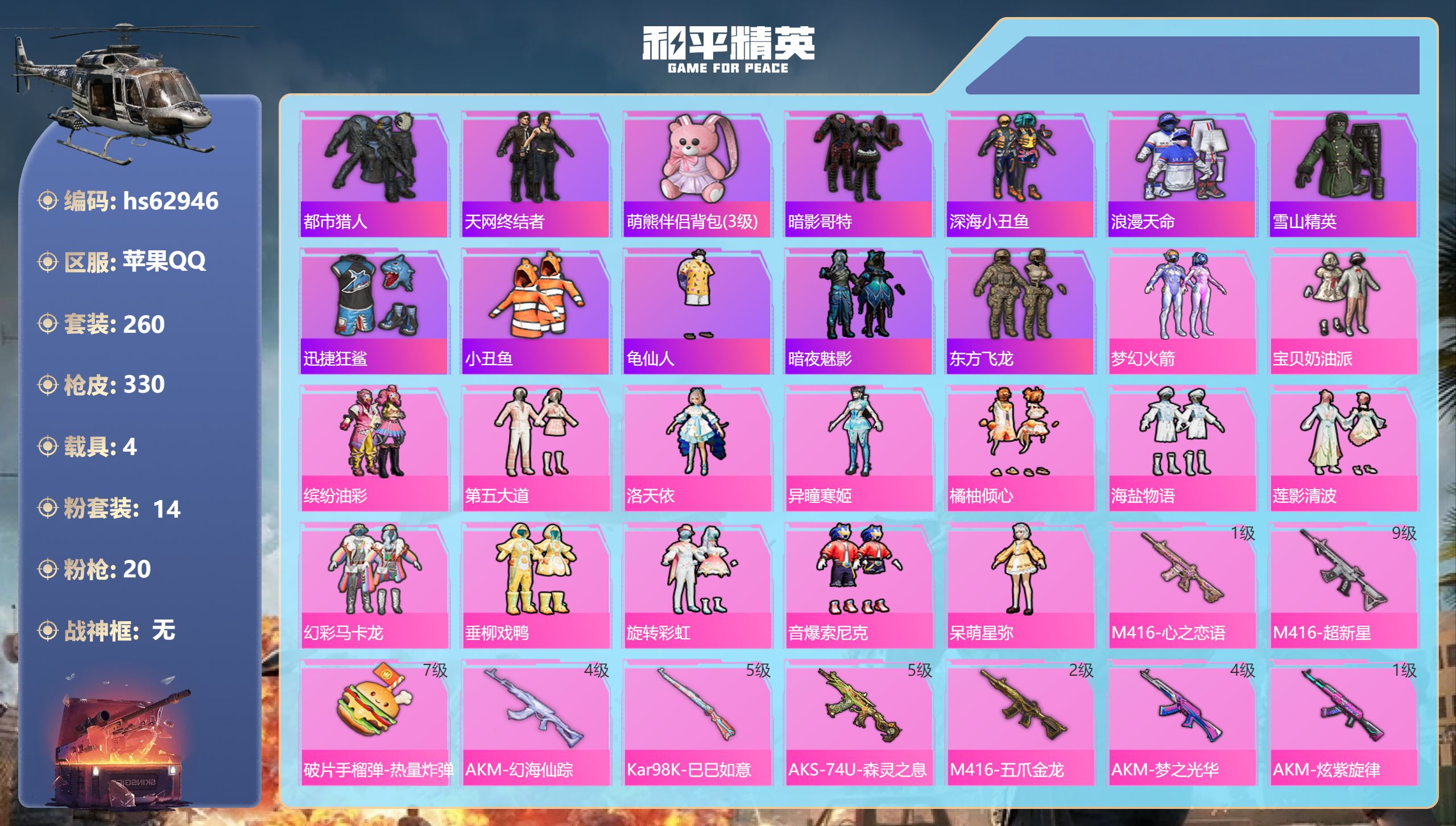 苹果手Q-17王牌印记-14粉装-20特效枪-4载具-热力值-2