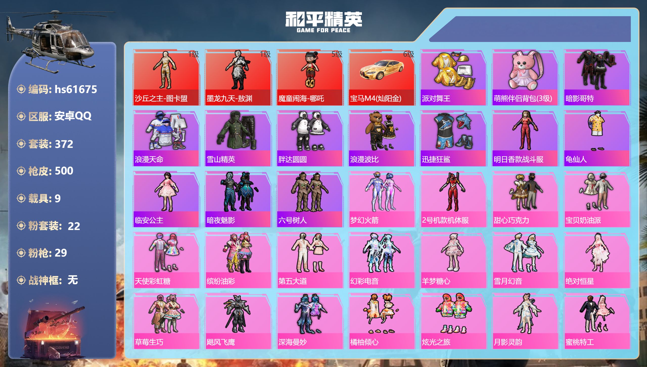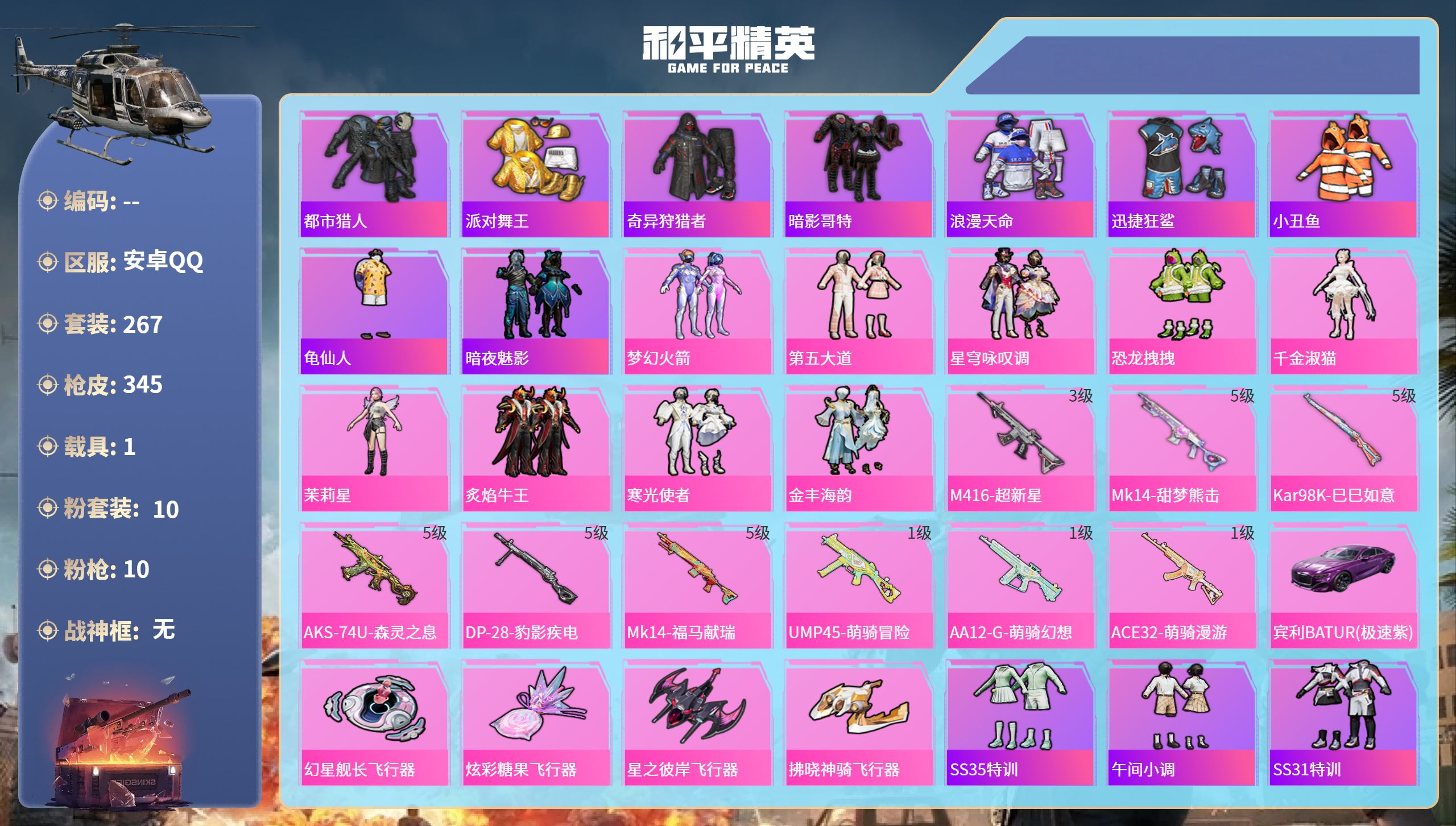 安卓手Q-21王牌印记-10粉装-10特效枪-1载具-热力值-26
