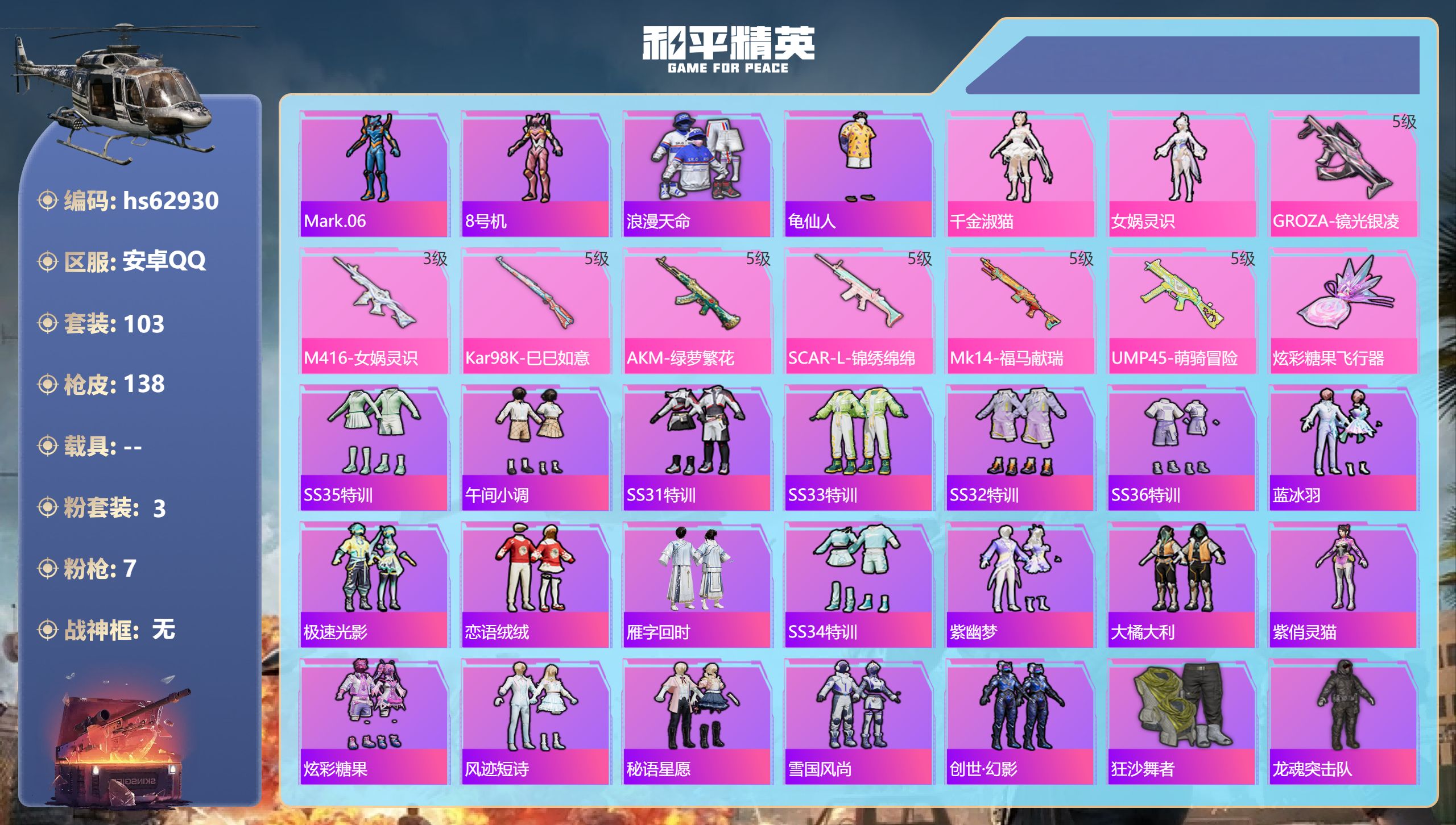 安卓手Q-5王牌印记-3粉装-7特效枪-40893热力值-103