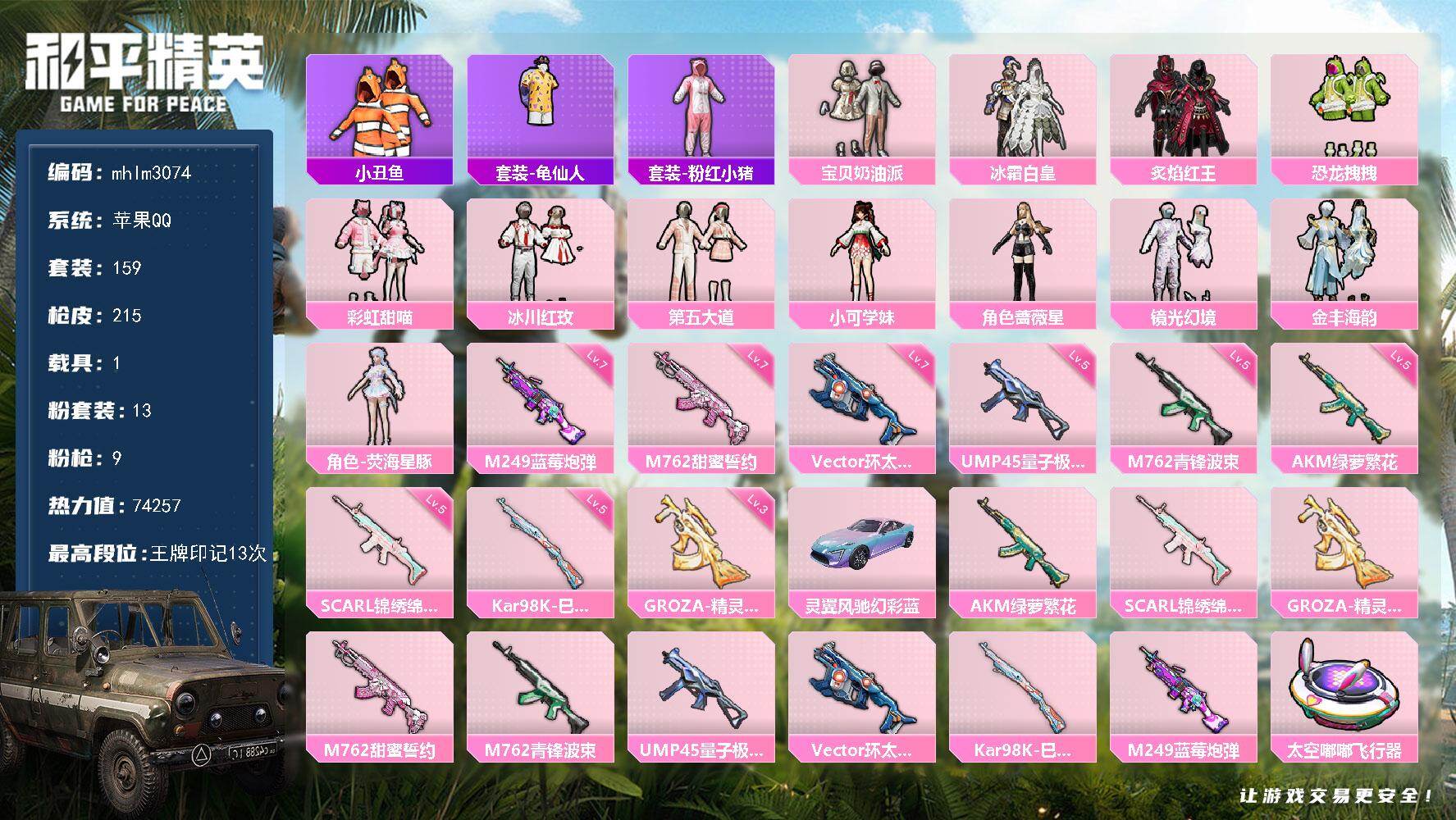 苹果 手Q-13粉装-9特效枪-1载具-4粉色飞行器-74257热力值-13王牌