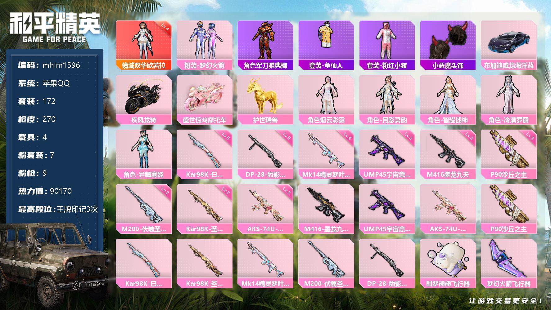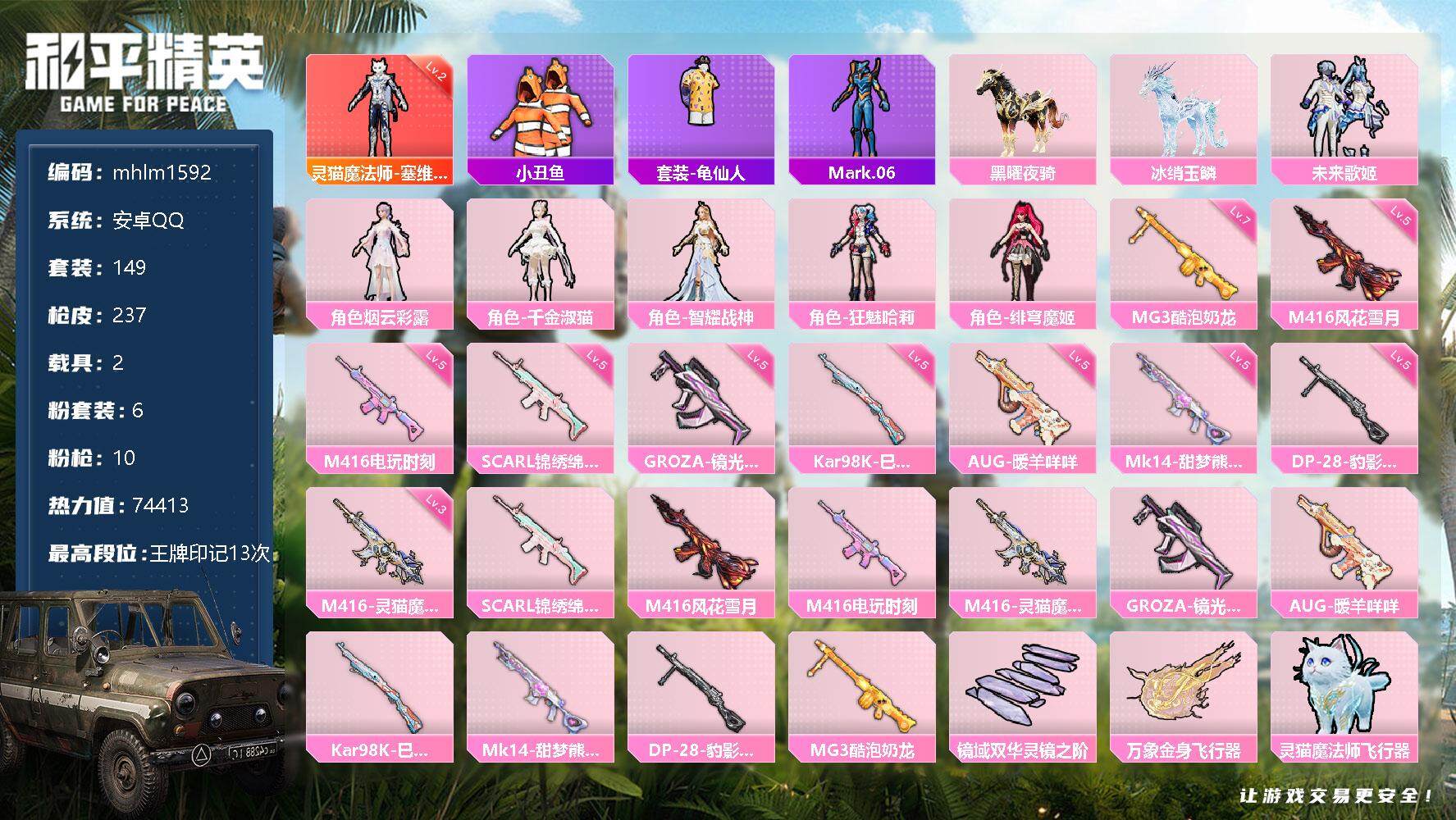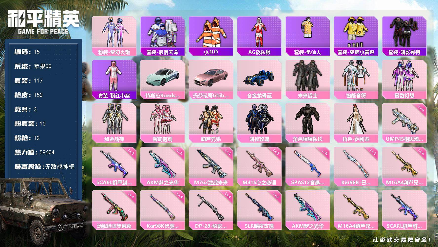 无敌战神框-10粉装-12特效枪-3载具-2粉色飞行器-59604热力值-10王牌印记-117套装-153枪皮
