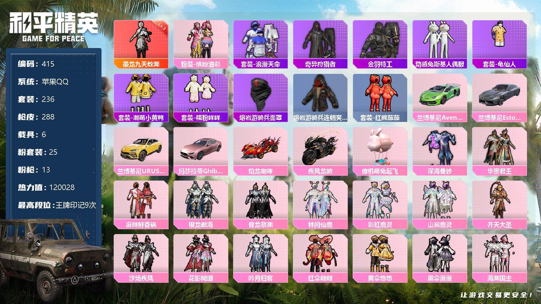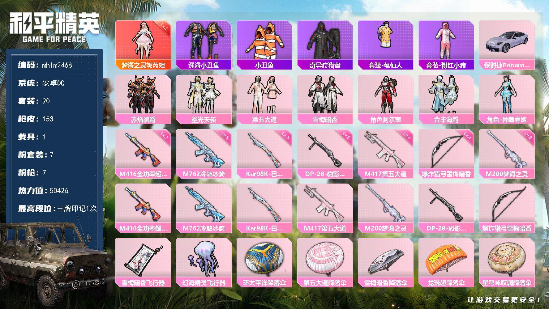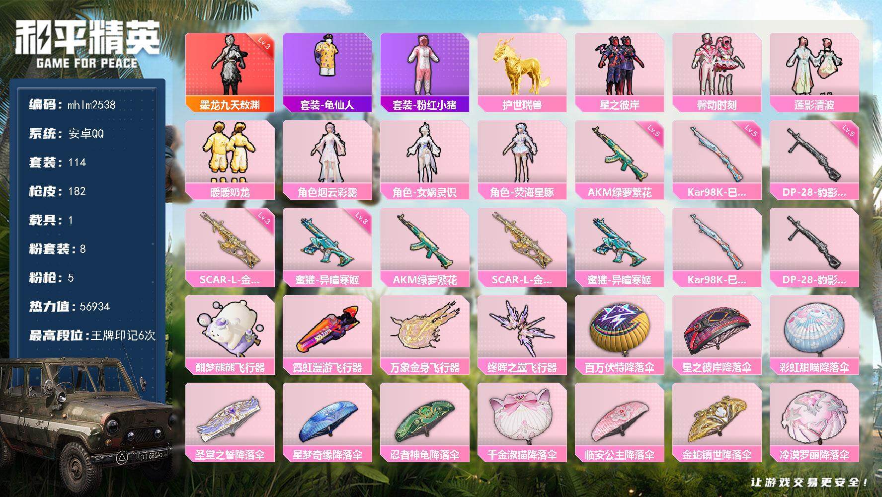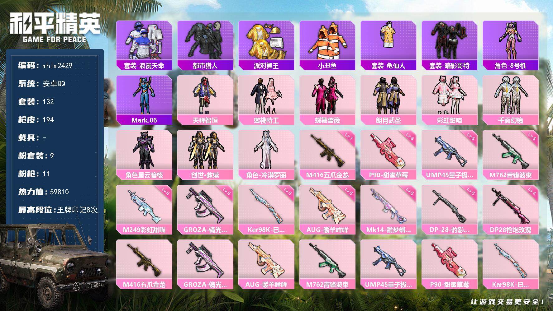 无敌战神框-10粉装-12特效枪-3载具-2粉色飞行器-59604热力值-10王牌印记-117套装-153枪皮