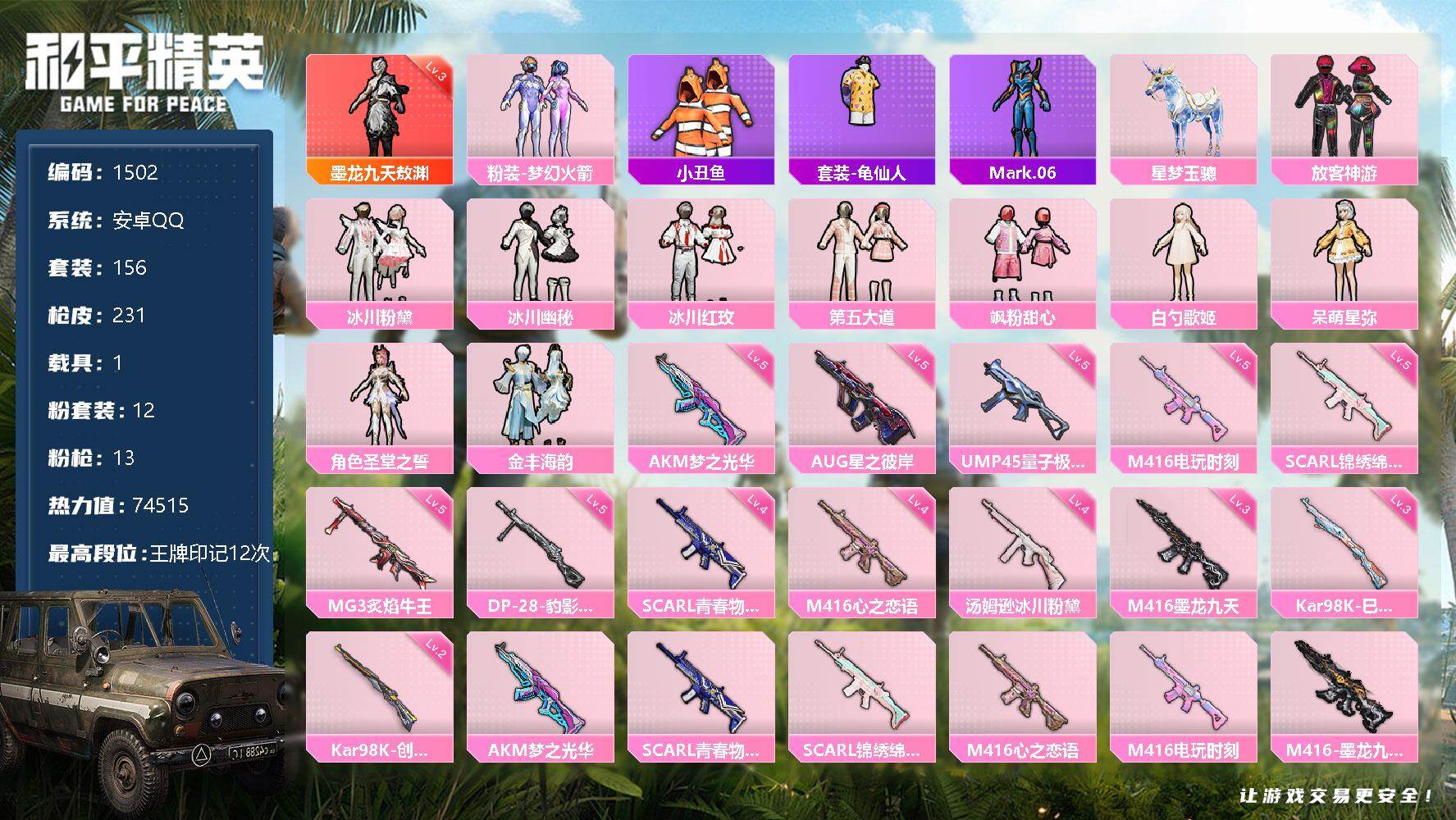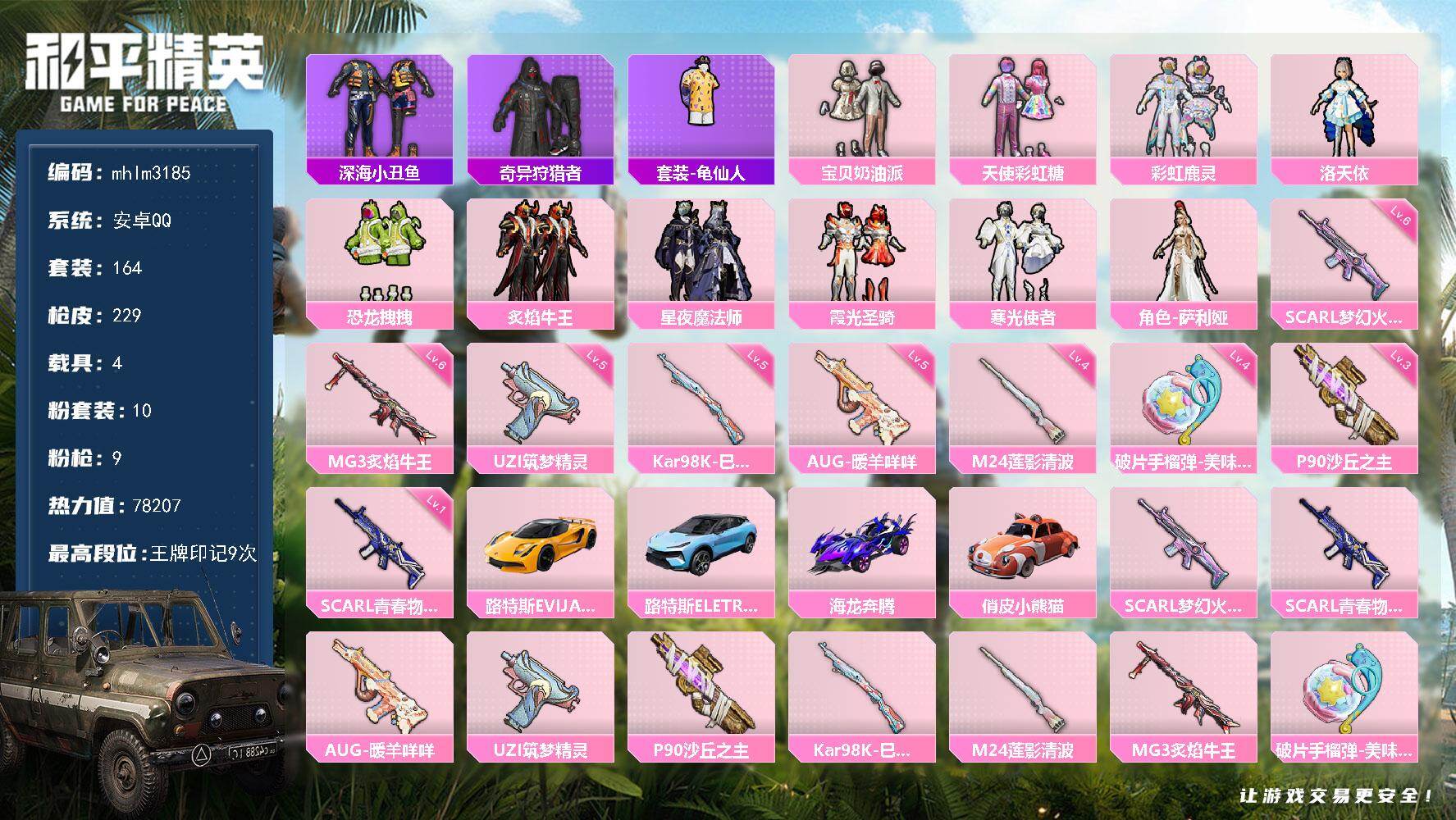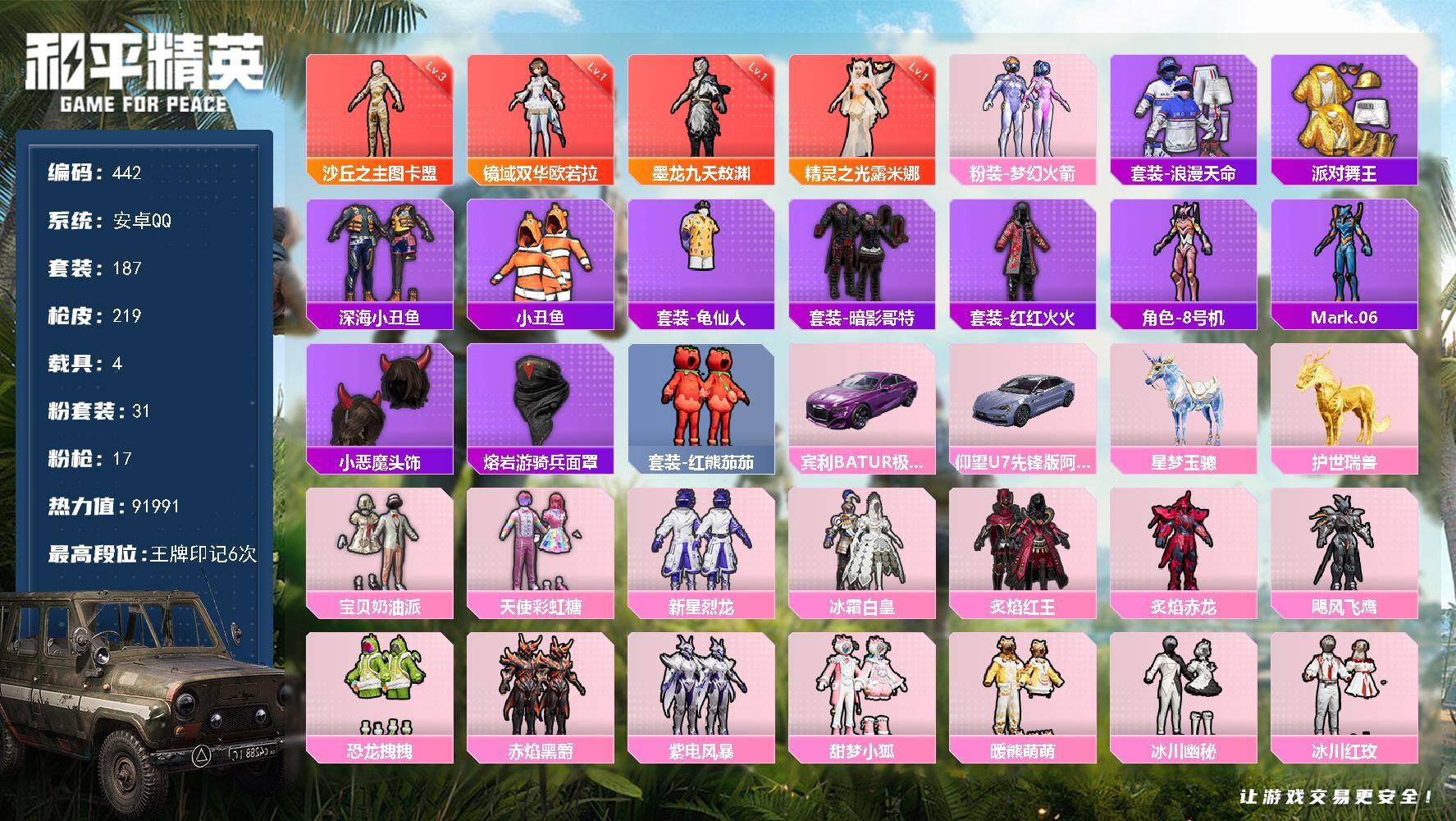 安卓 手Q-1神装-6粉装-10特效枪-2载具-4粉色飞行器-74413热力值-