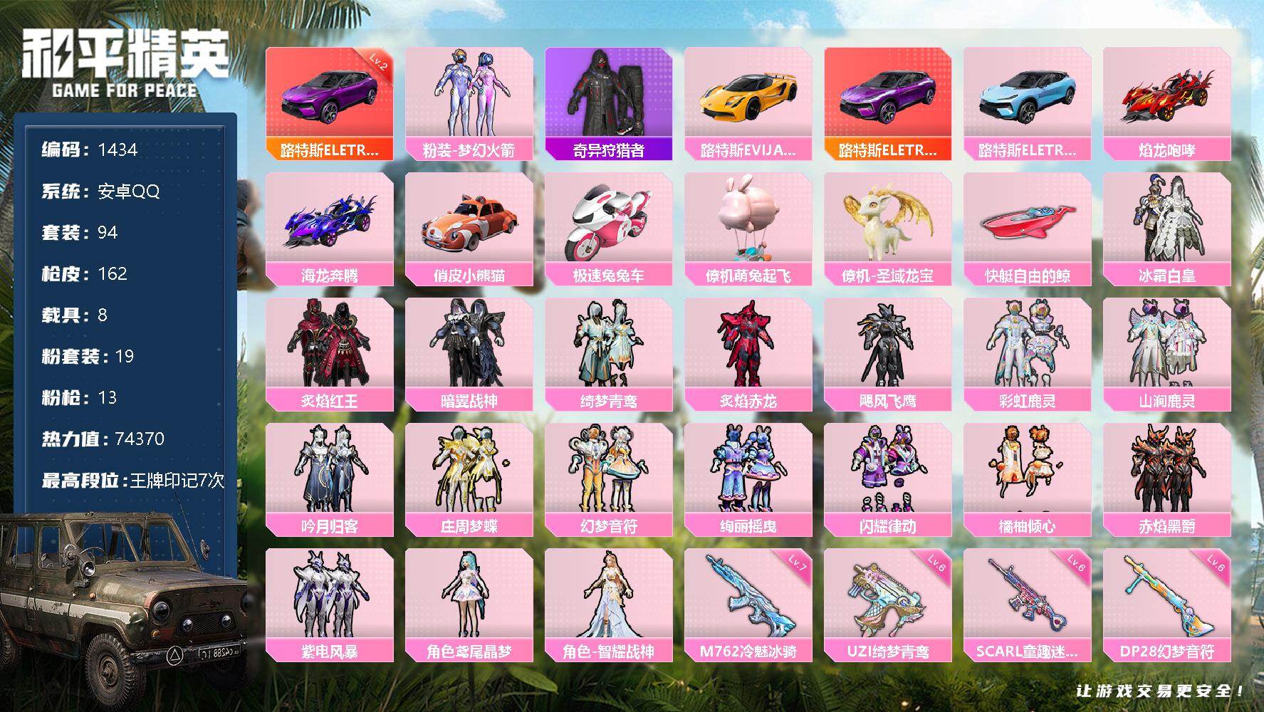 安卓 手Q-19粉装-13特效枪-8载具-9粉色飞行器-74370热力值-7王牌