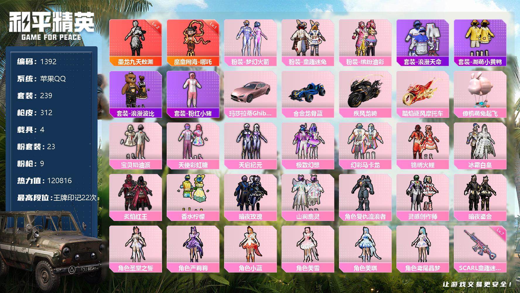 2神装-23粉装-9特效枪-4载具-10粉色飞行器-120816热力值-22王牌印记-239套装-312枪皮