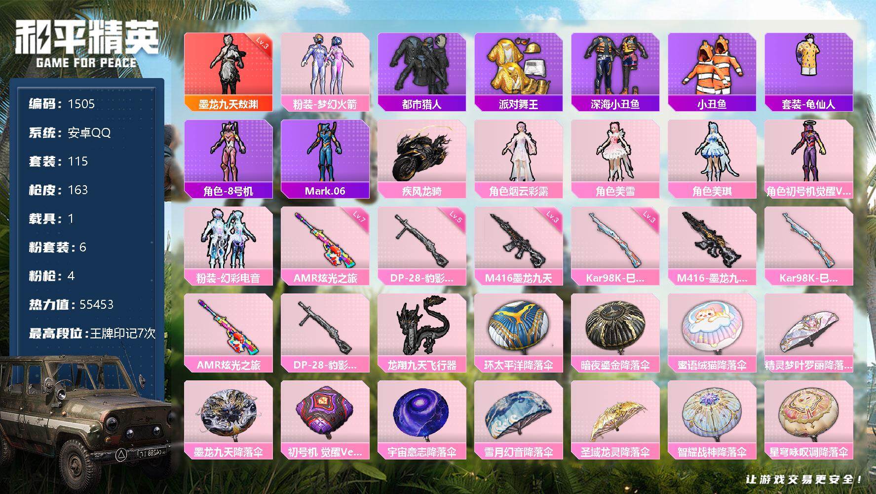 安卓 手Q-1神装-6粉装-4特效枪-1载具-2粉色飞行器-55453热力值-7