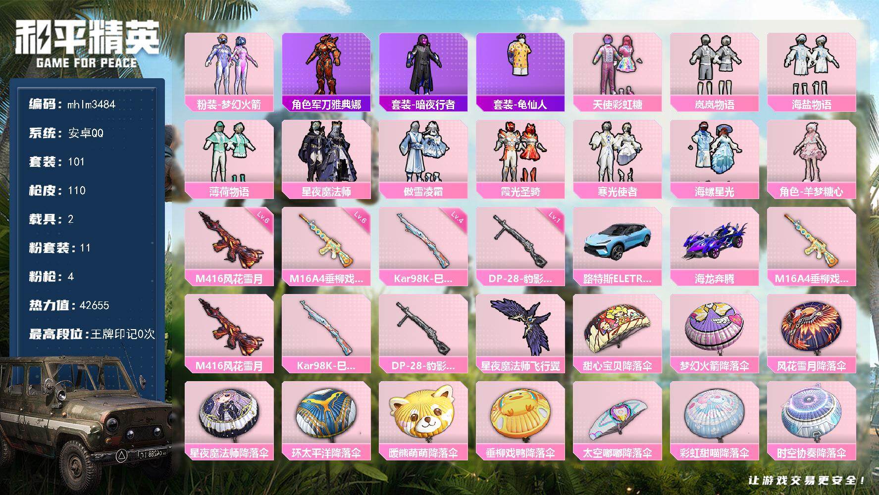 安卓 手Q-11粉装-4特效枪-2载具-1粉色飞行器-42655热力值-1王牌印