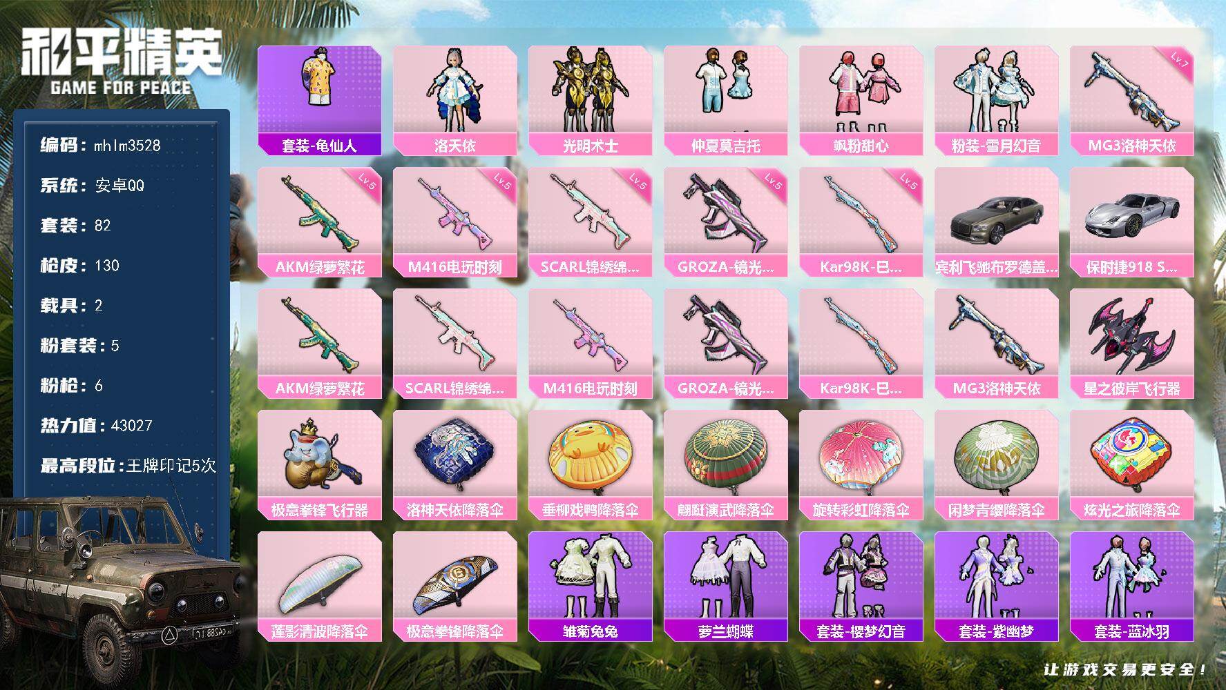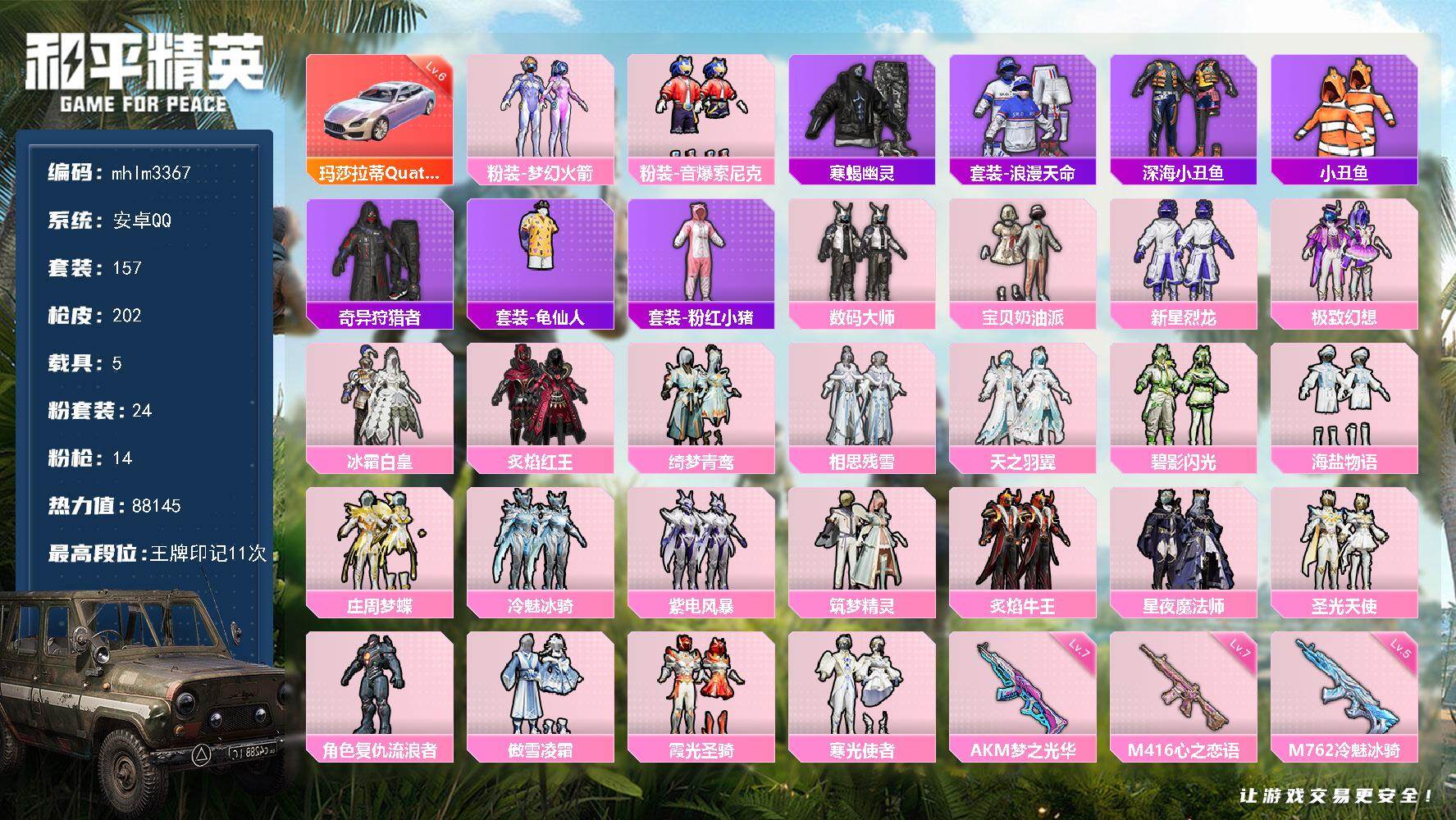 安卓 手Q-24粉装-14特效枪-5载具-5粉色飞行器-88145热力值-11王