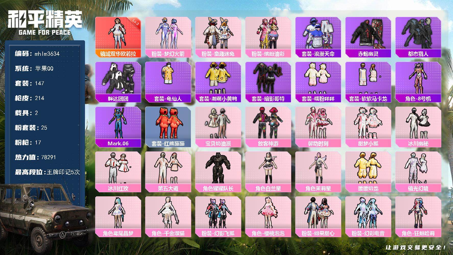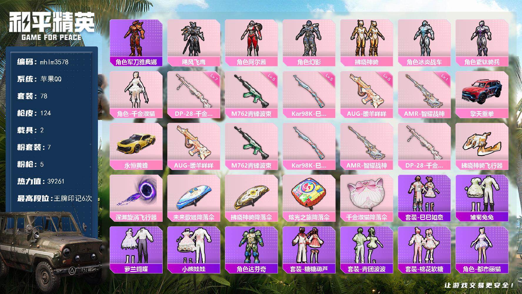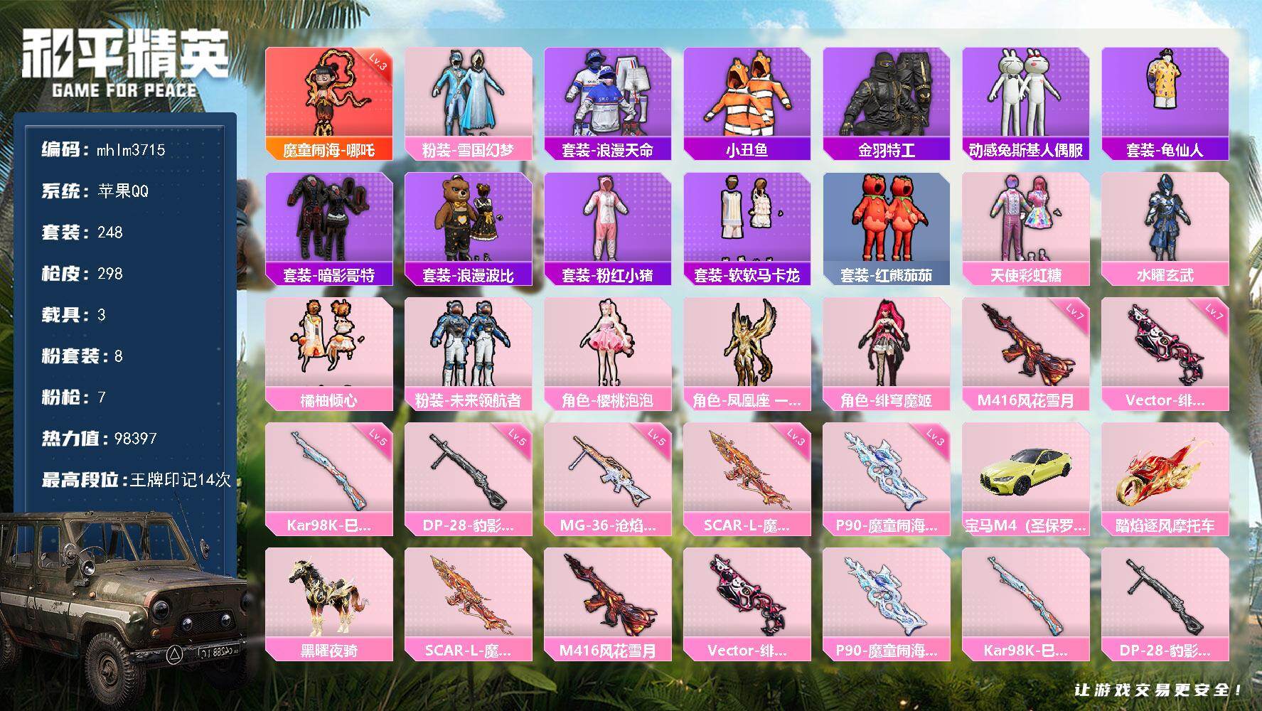 苹果 手Q-1神装-8粉装-7特效枪-3载具-7粉色飞行器-98397热力值-1