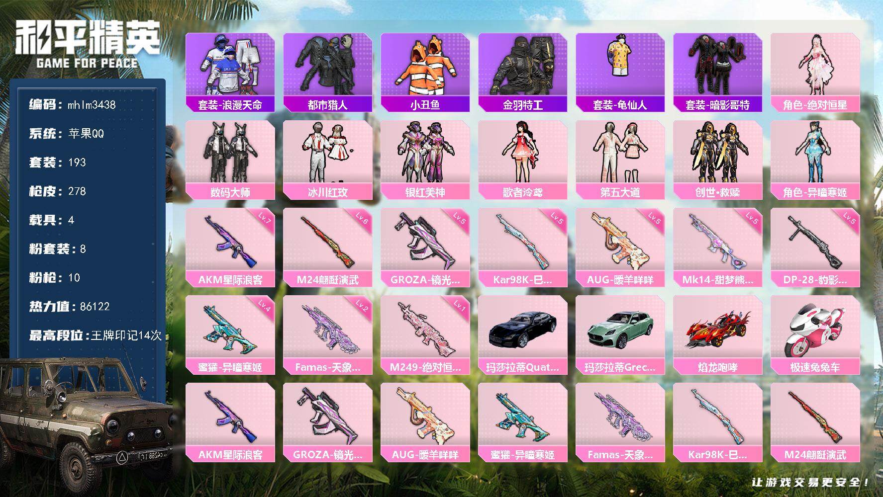 8粉装-10特效枪-4载具-5粉色飞行器-86122热力值-14王牌印记-193套装-278枪皮