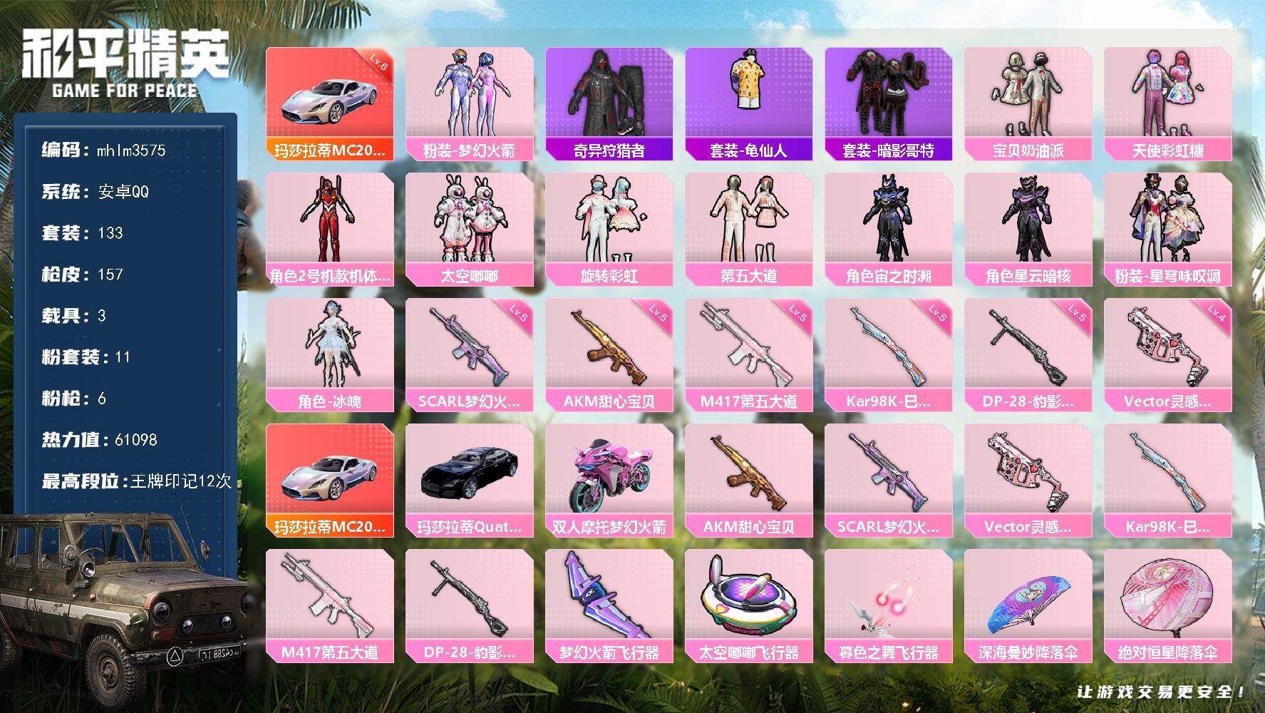 安卓 手Q-11粉装-6特效枪-3载具-4粉色飞行器-61098热力值-12王牌