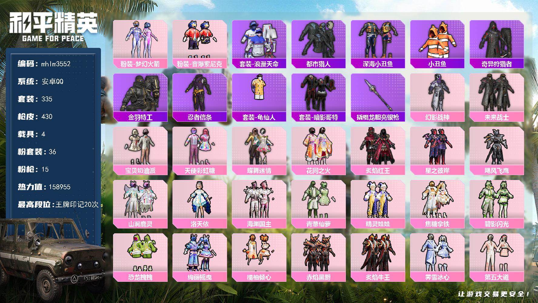 安卓 手Q-36粉装-15特效枪-4载具-16粉色飞行器-158955热力值-2