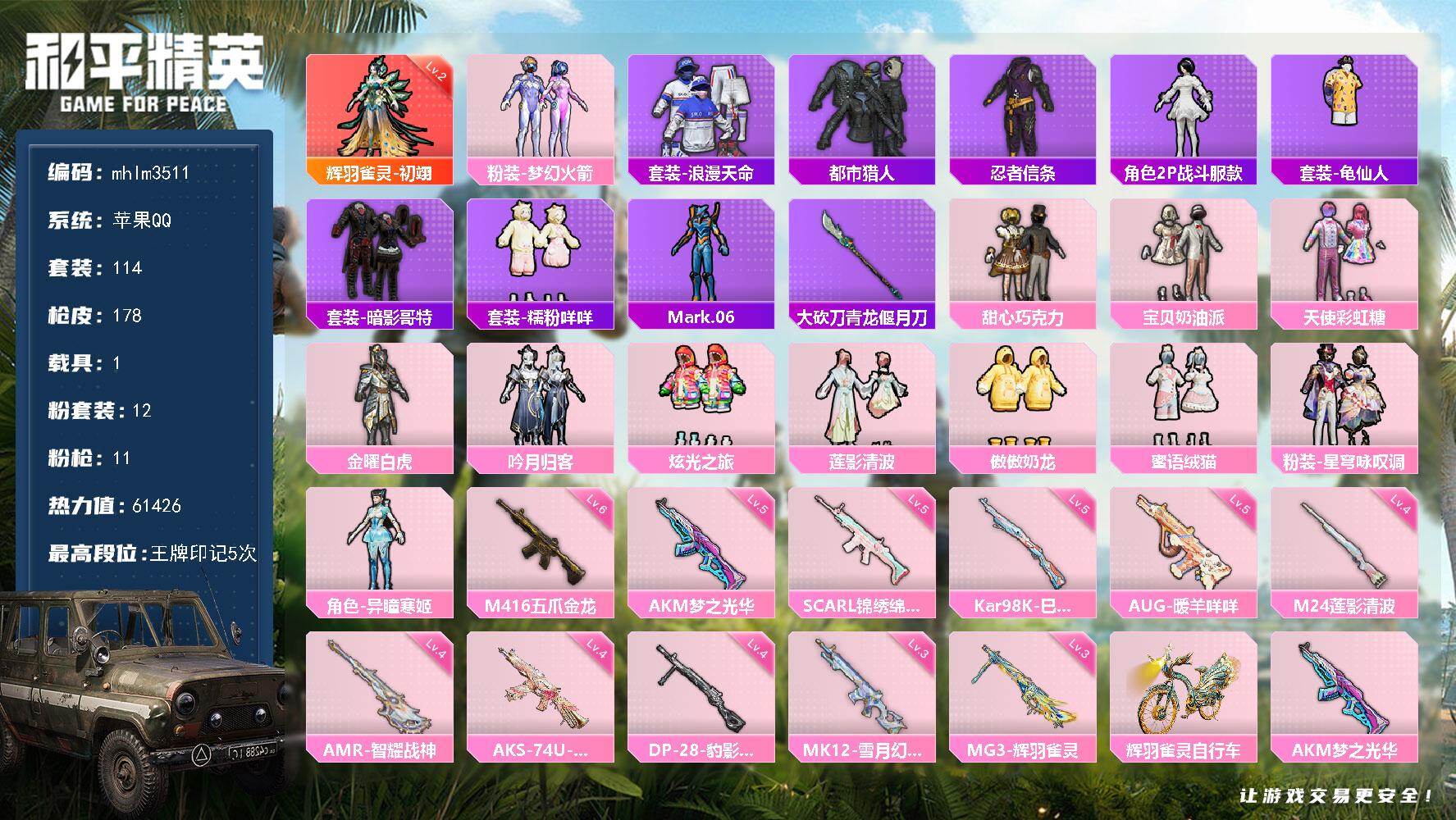 苹果 手Q-1神装-12粉装-11特效枪-1载具-3粉色飞行器-61426热力值