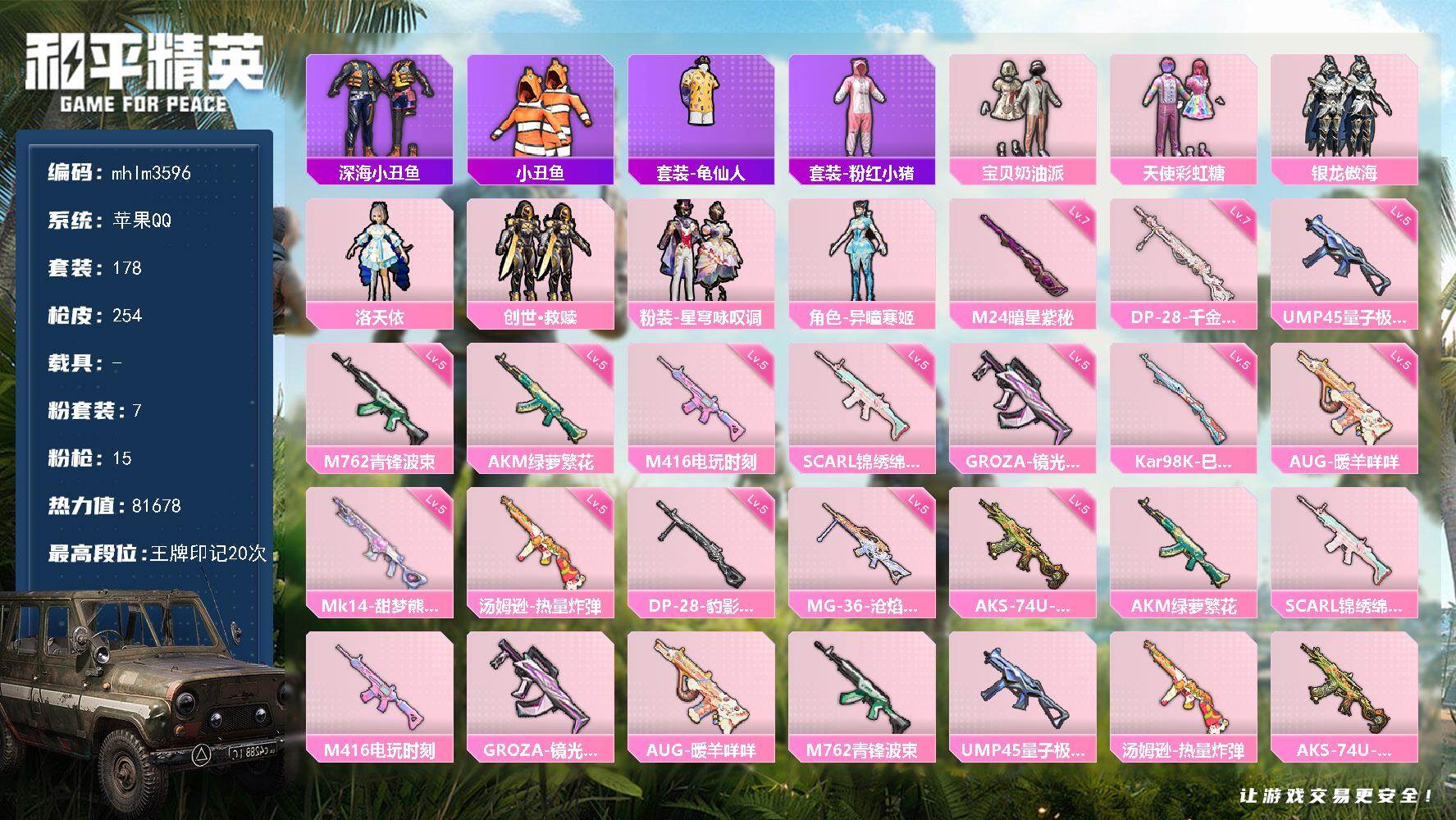 苹果 手Q-7粉装-15特效枪-0载具-4粉色飞行器-81678热力值-20王牌