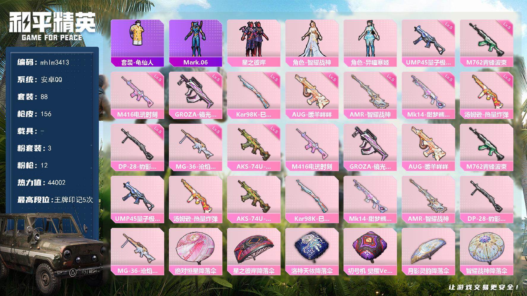 安卓 手Q-3粉装-12特效枪-0载具-1粉色飞行器-44002热力值-5王牌印