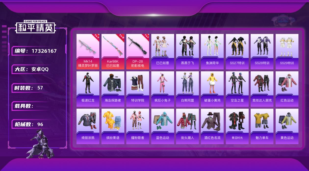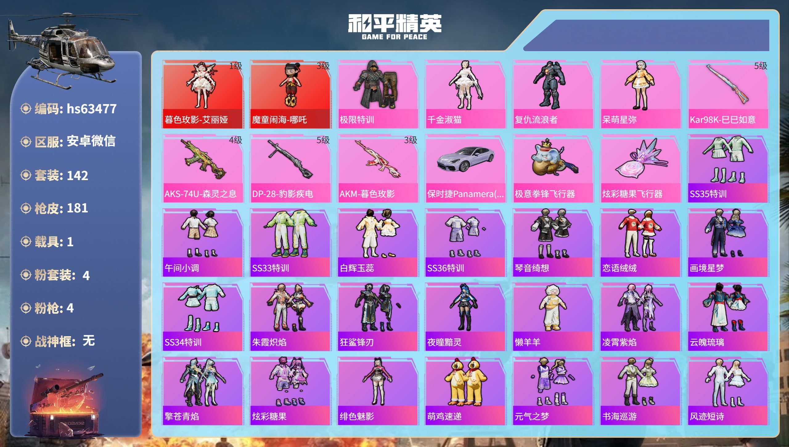 hs63477 安卓微-8王牌印记-2红装-4粉装-4特效枪-1载具-61847热力值-142套装
