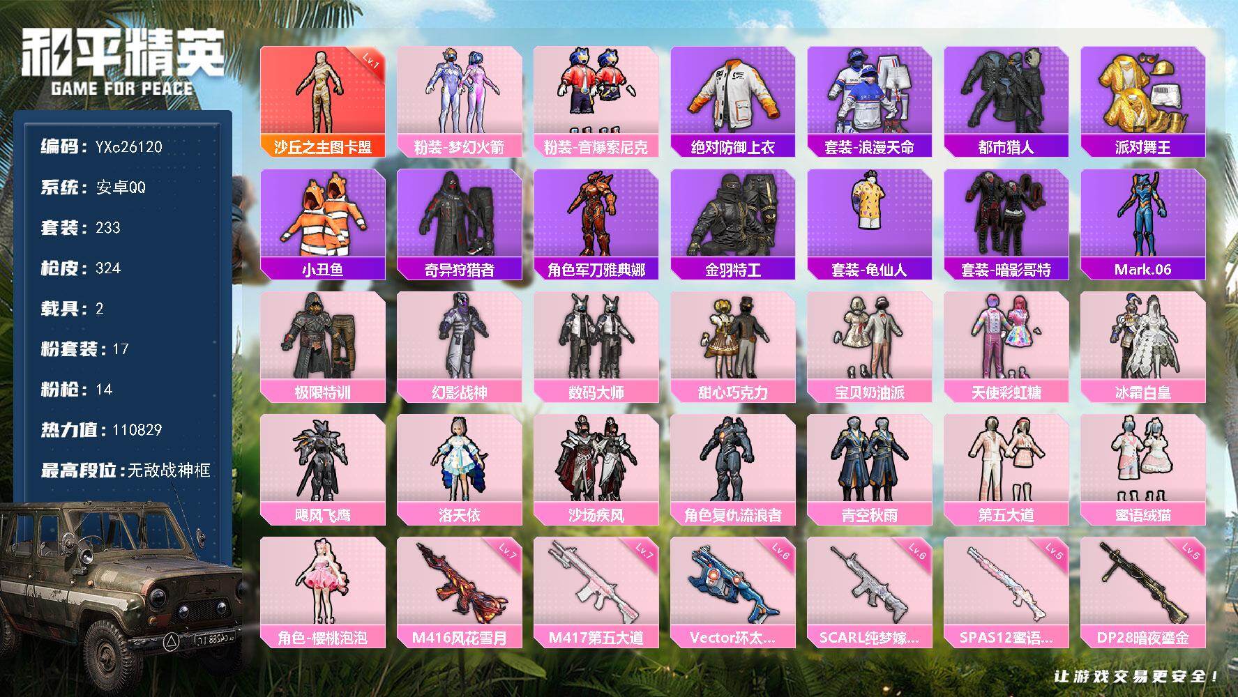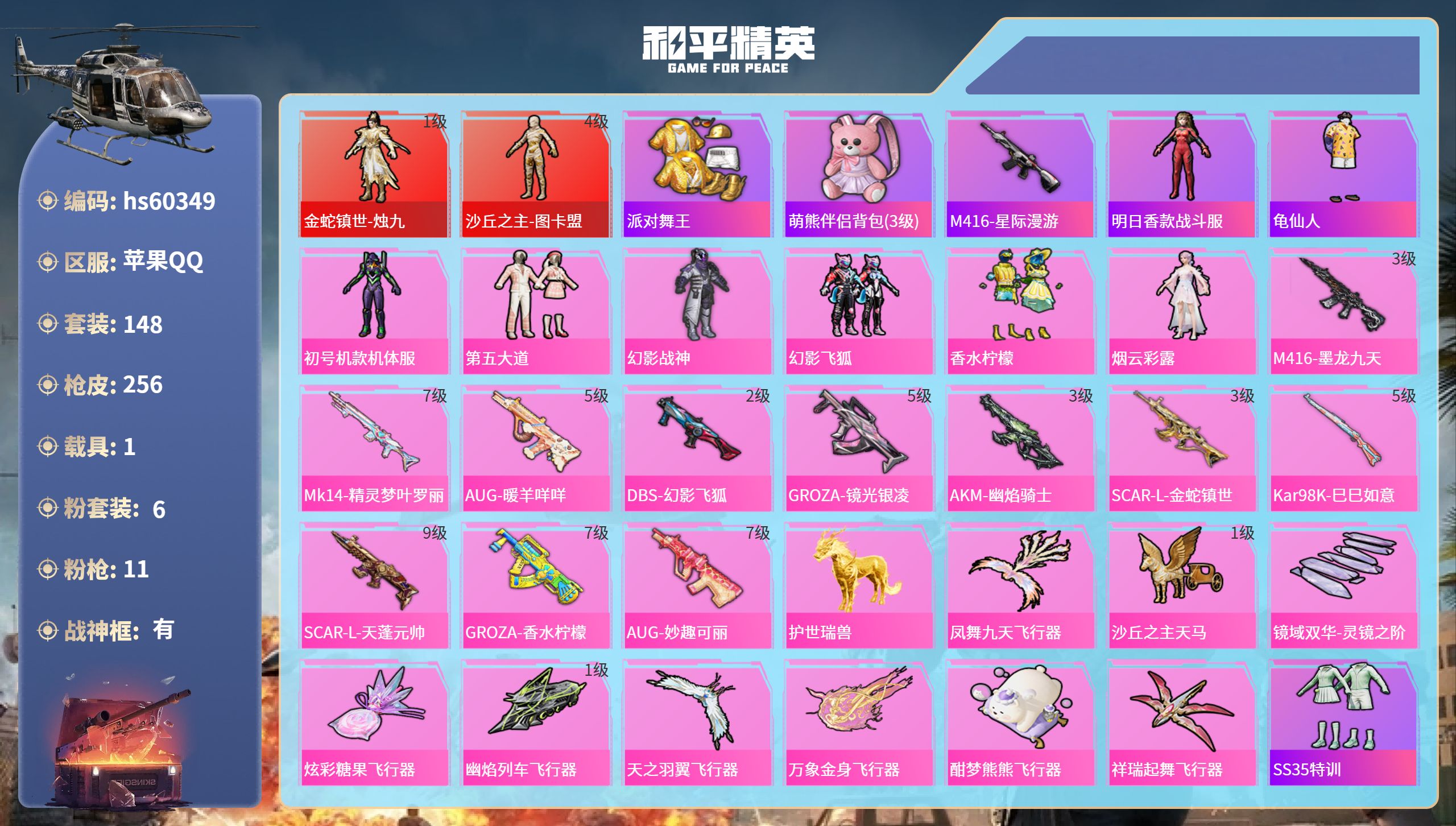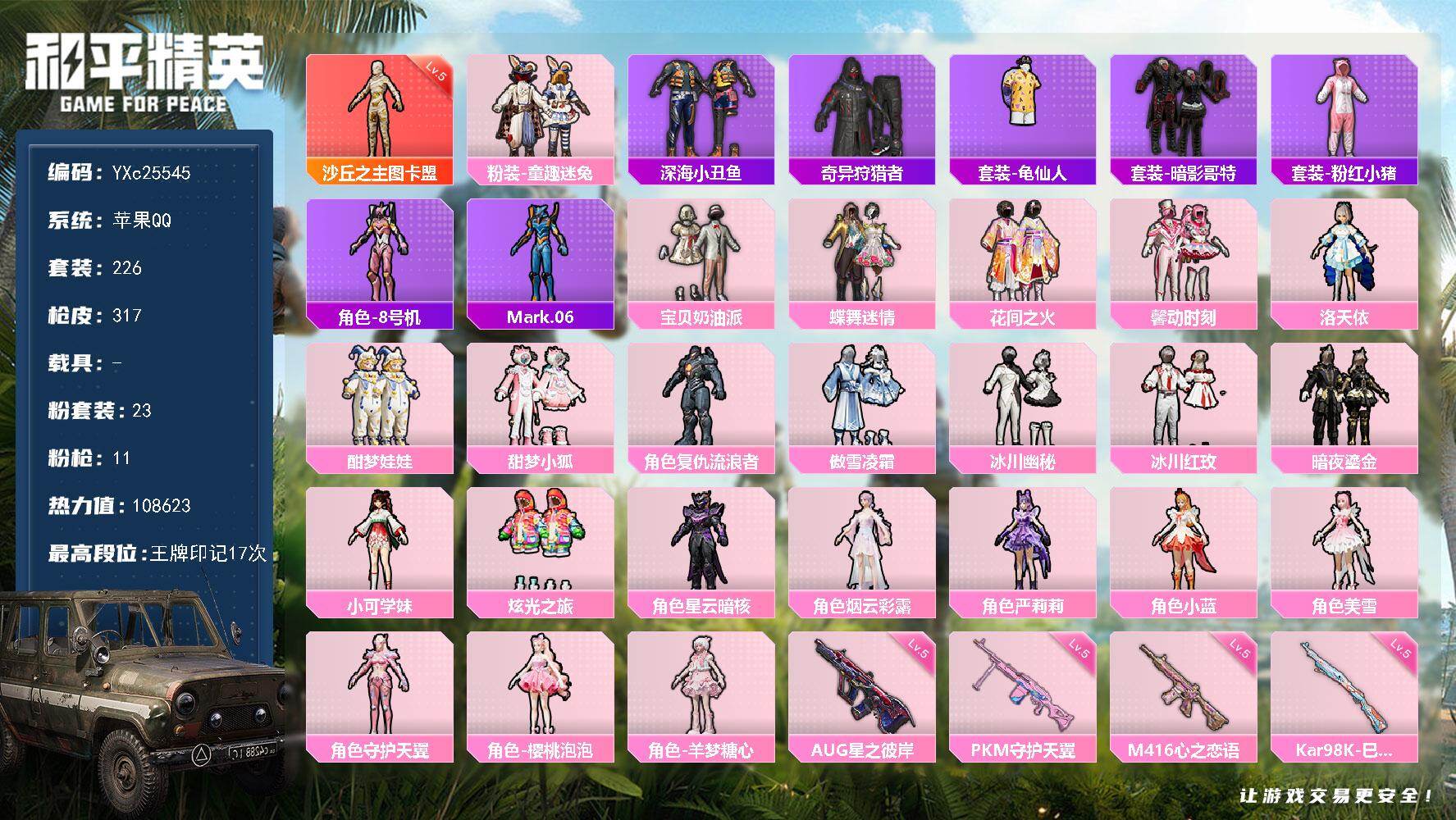 17王牌印记-有战神框-2红装-6粉装-11特效枪-1载具-85252热力值-148套装-256枪皮-4卓越印记-4传奇印记