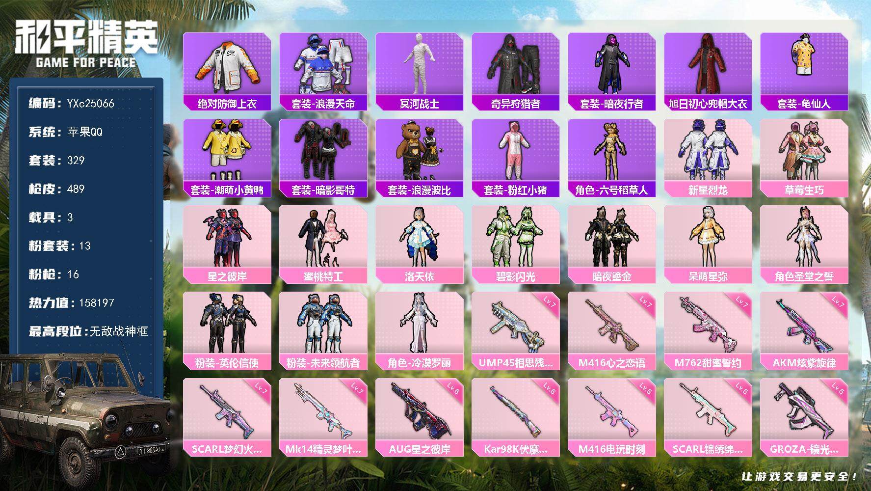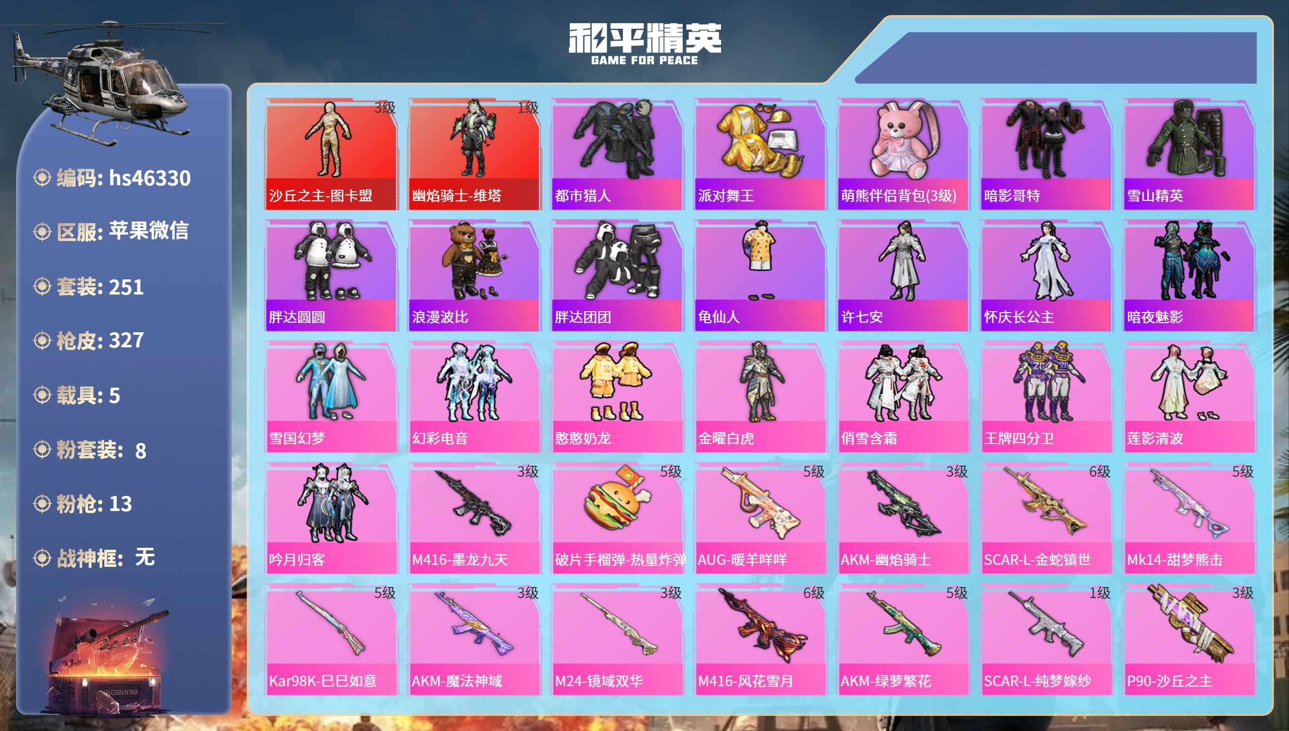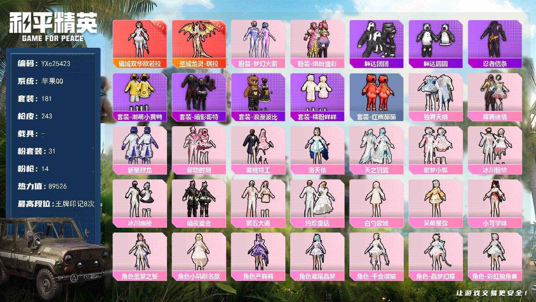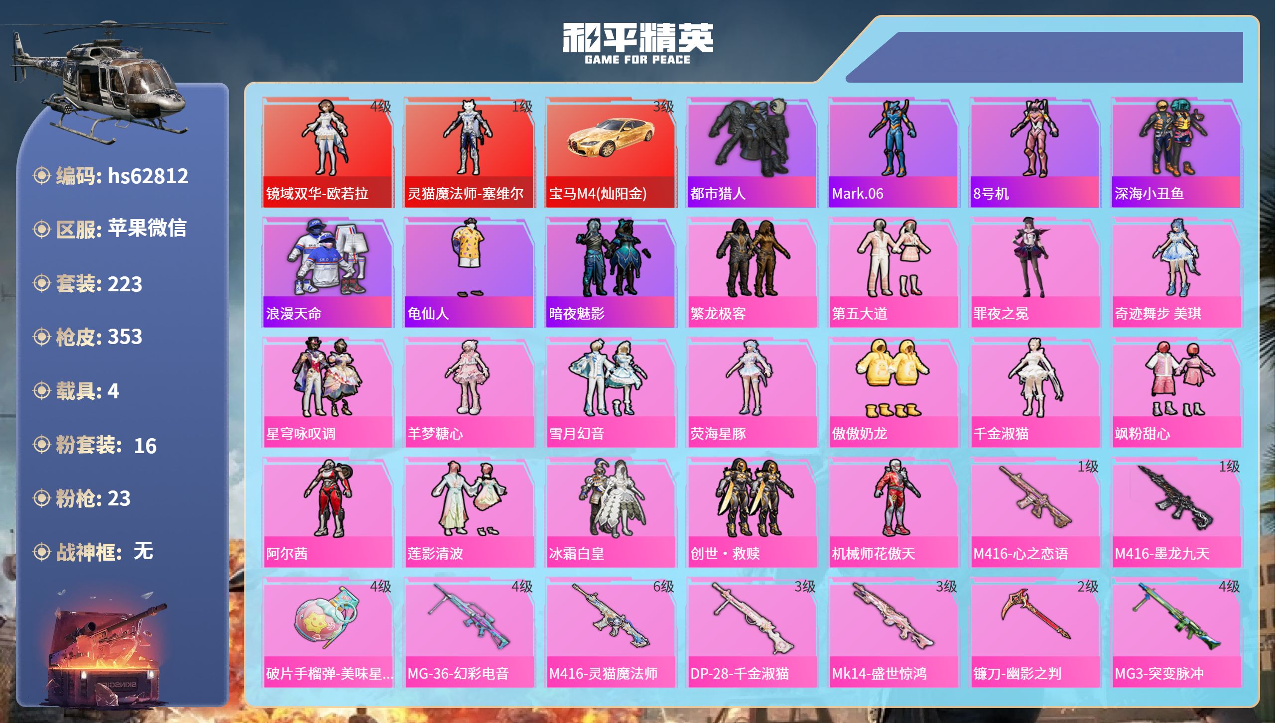 14王牌印记-2红装-16粉装-23特效枪-4载具-热力值-223套装-353枪皮