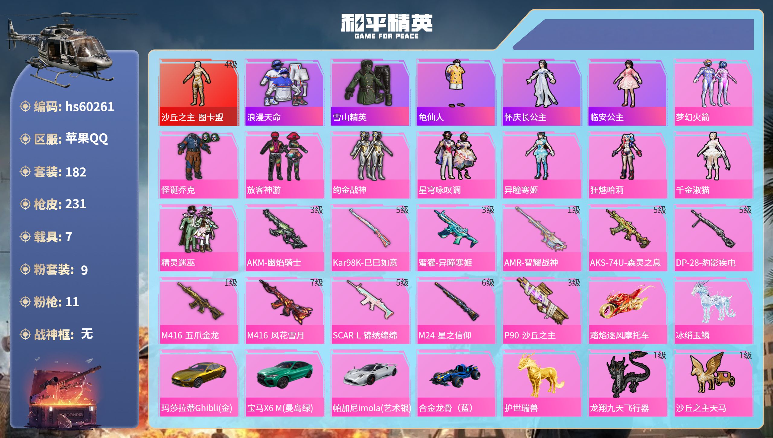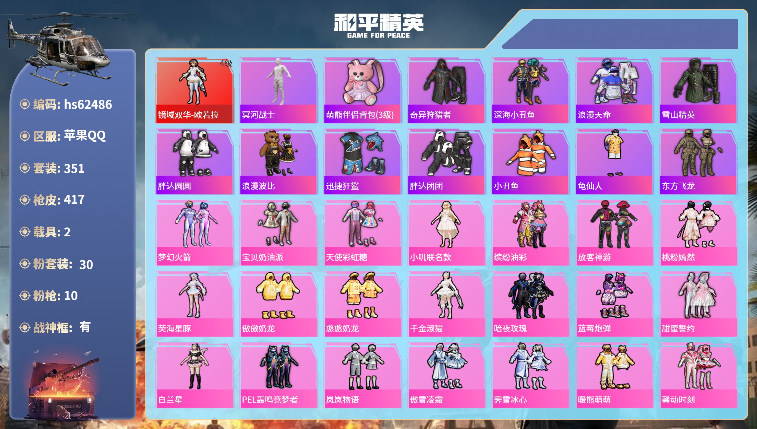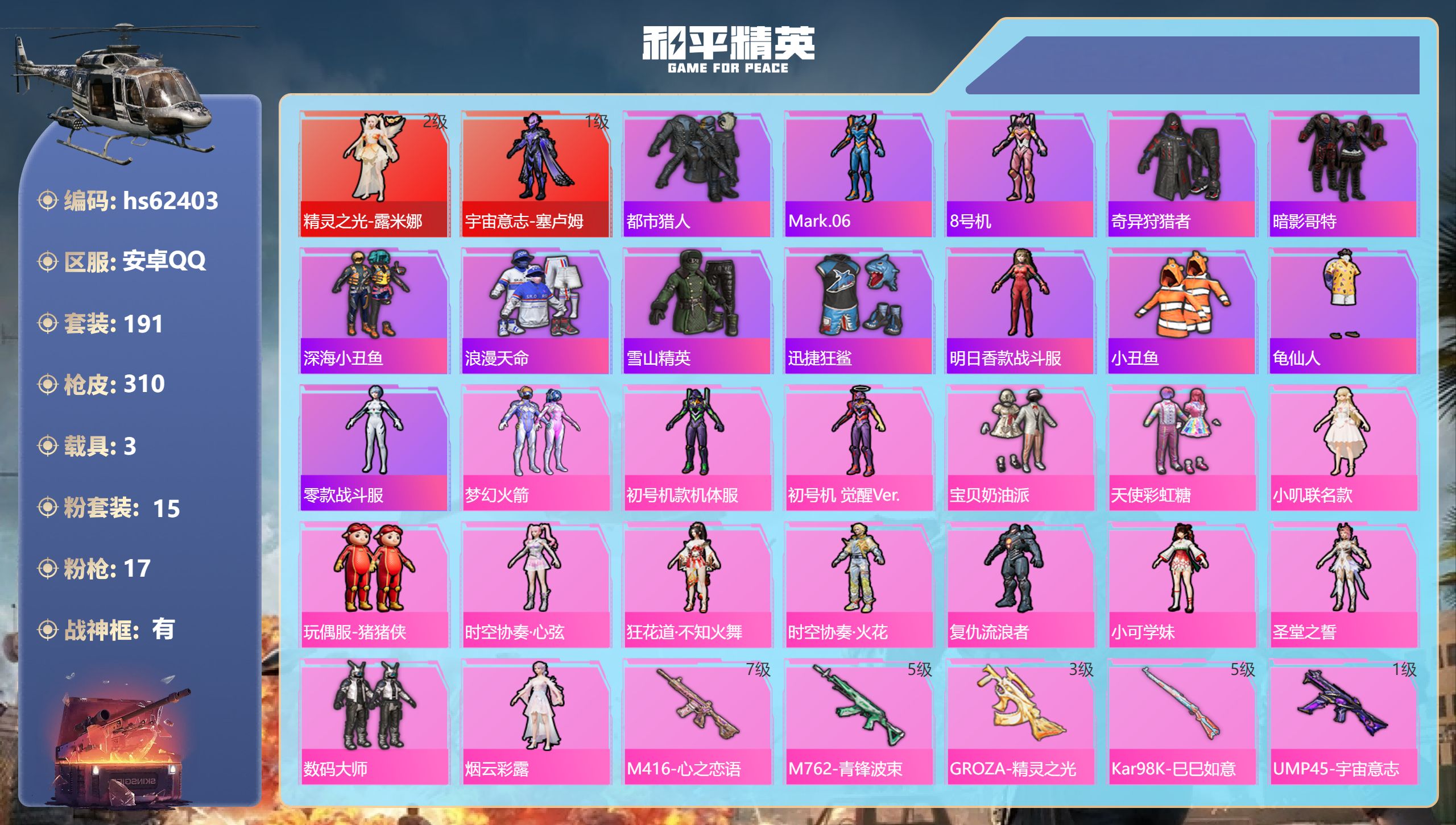1神装-13粉装-10特效枪-5载具-9粉色飞行器-69640热力值-10王牌印记-118套装-186枪皮