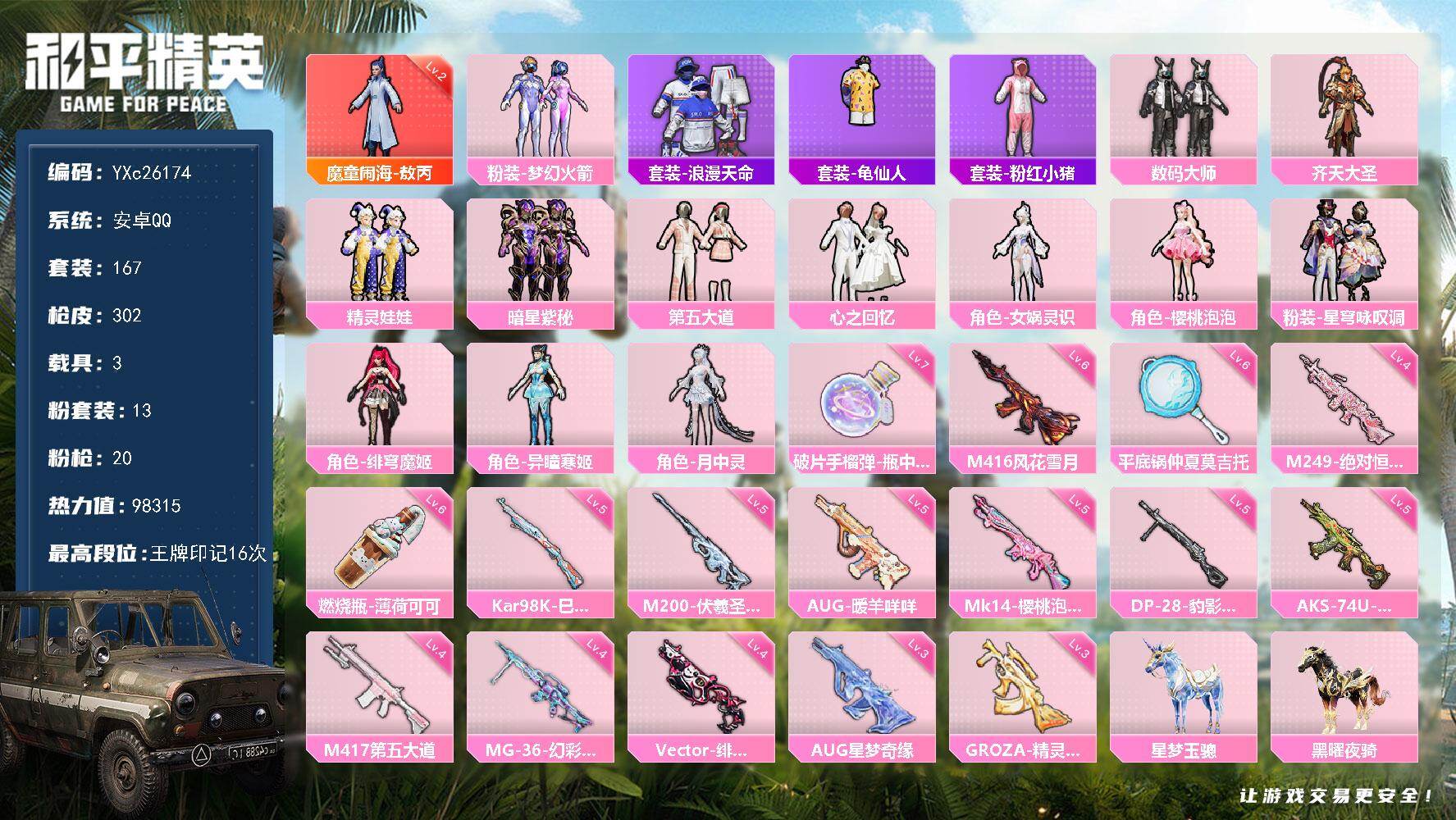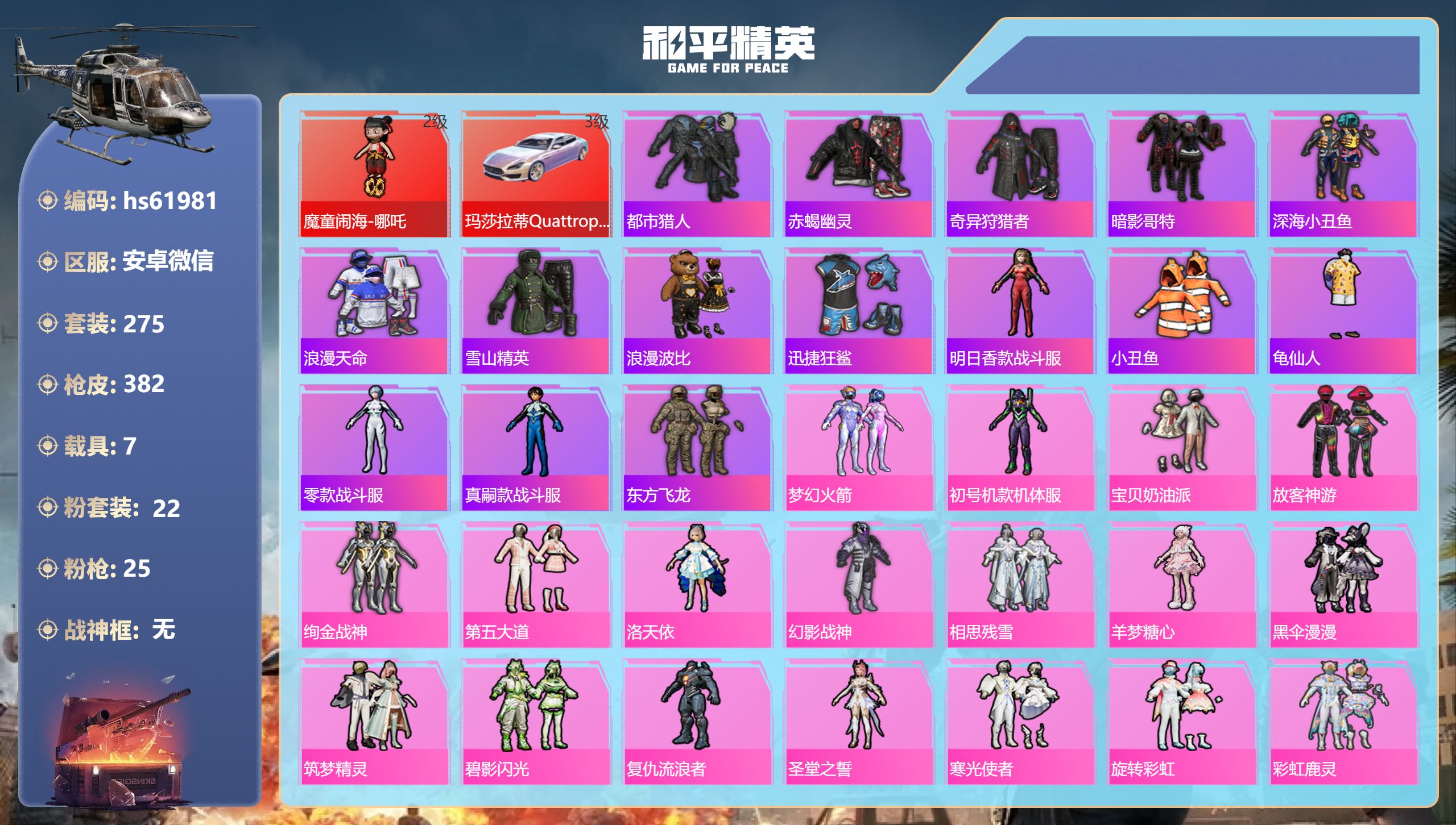 安卓微信-22王牌印记-1红装-22粉装-25特效枪-7载具-热