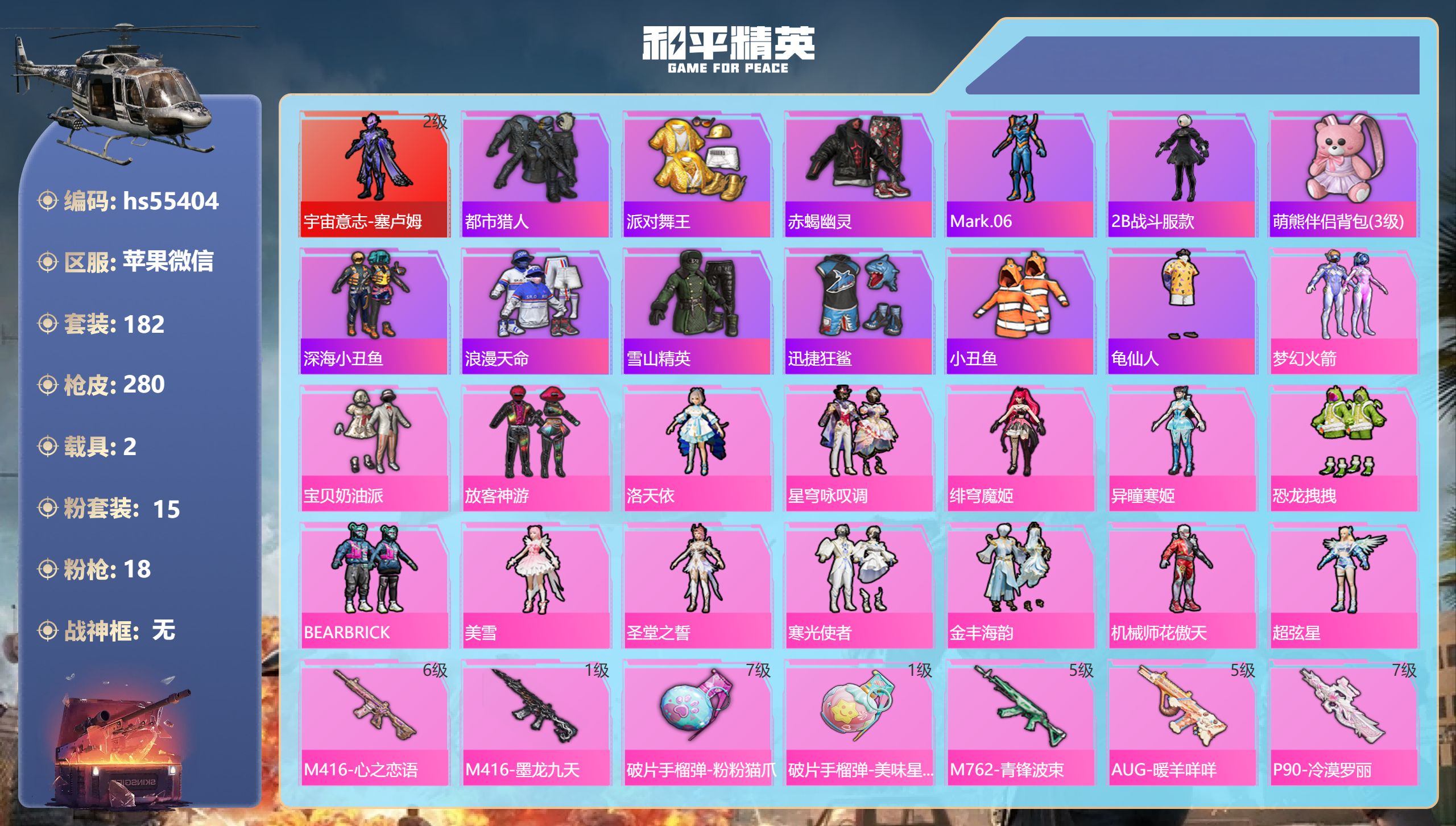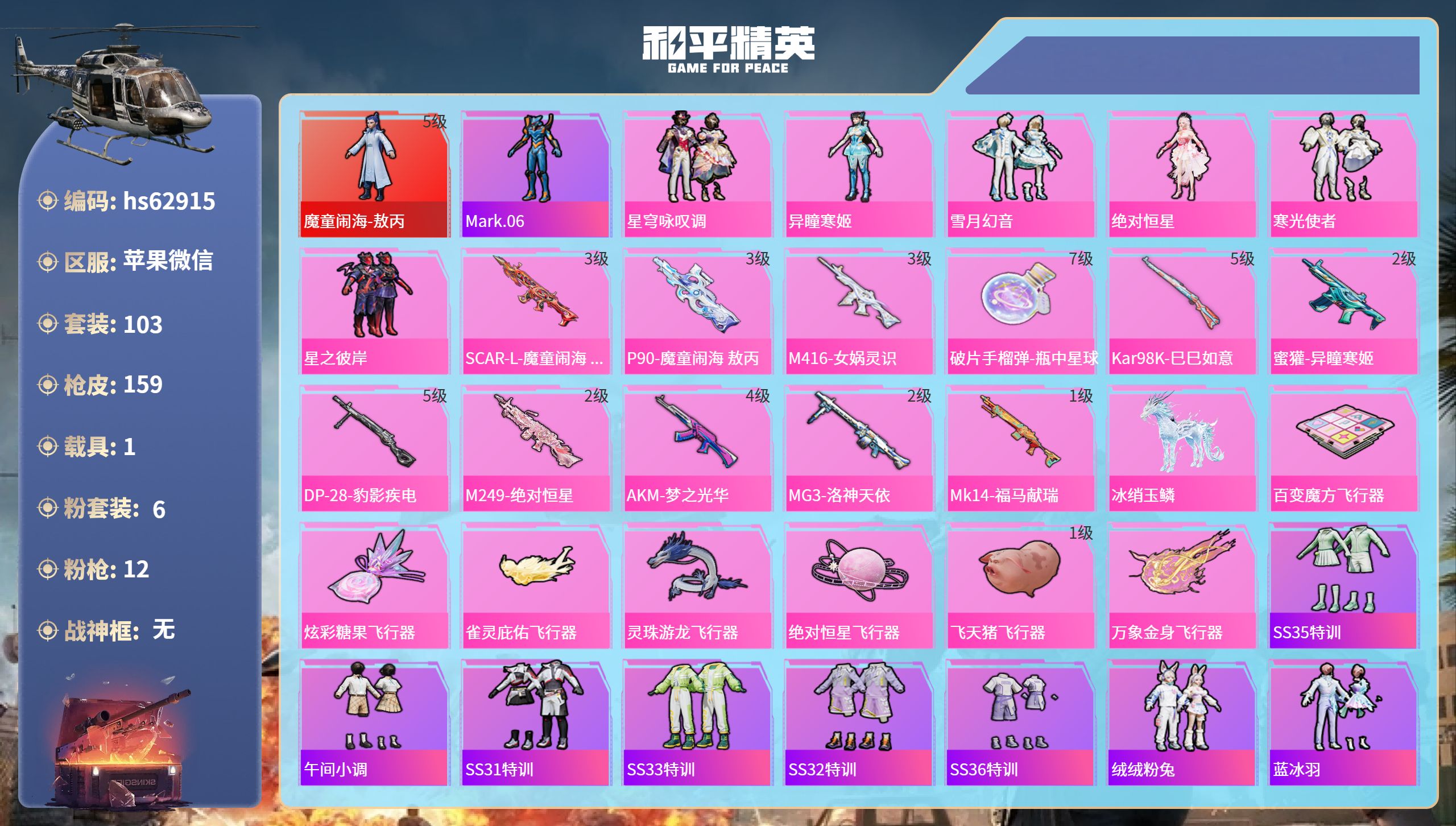 2神装-4粉装-12特效枪-2载具-5粉色飞行器-56777热力值-13王牌印记-84套装-173枪皮