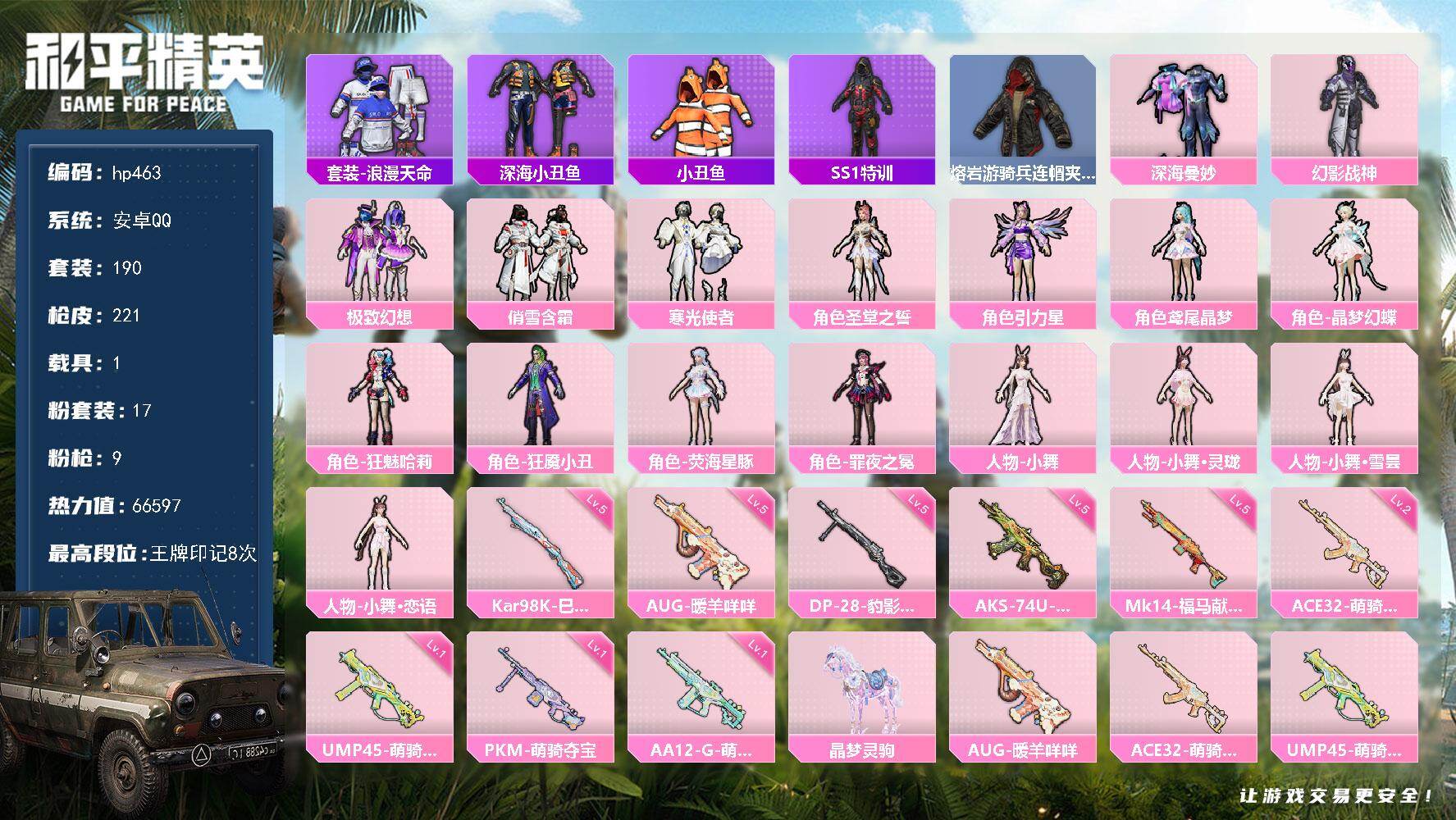17粉装-9特效枪-1载具-5粉色飞行器-66597热力值-8王牌印记-190套装-221枪皮