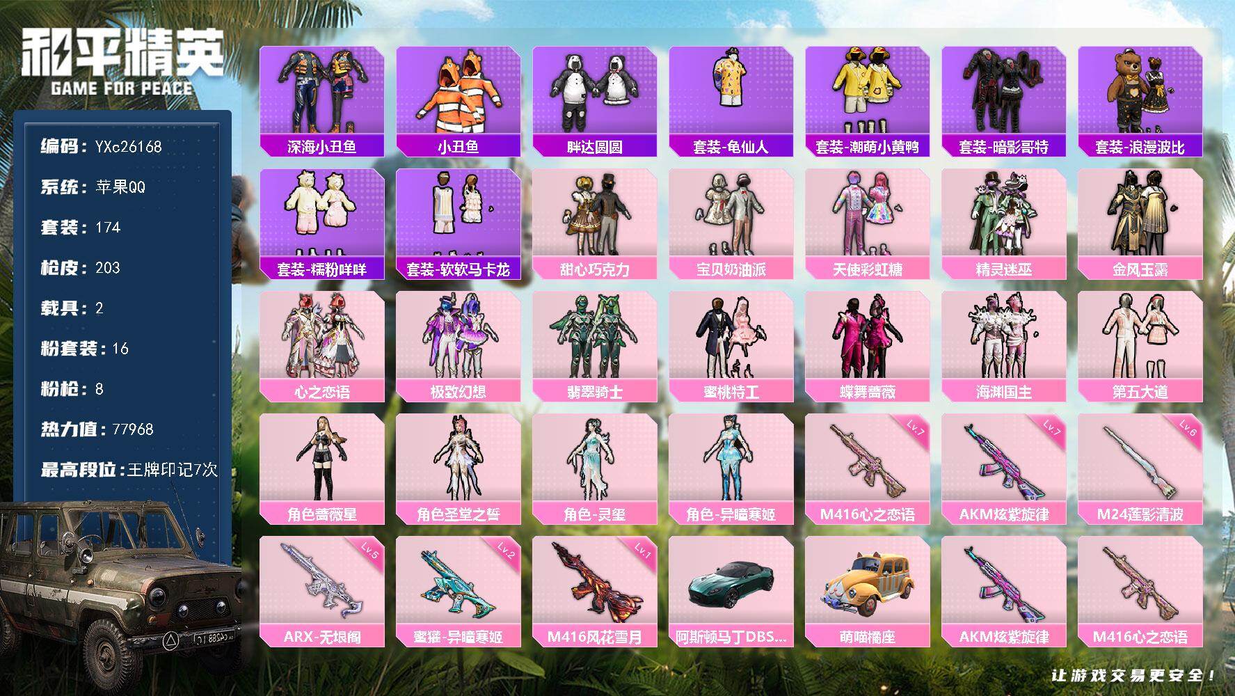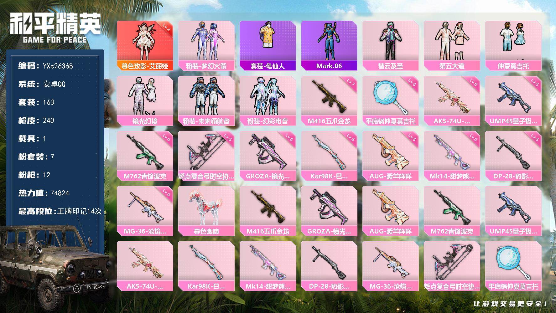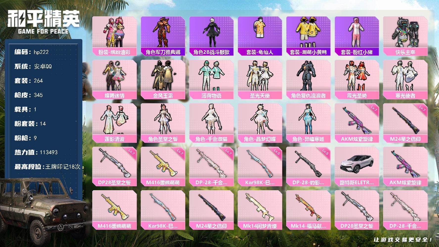 14粉装-9特效枪-1载具-2粉色飞行器-113493热力值-18王牌印记-264套装-345枪皮