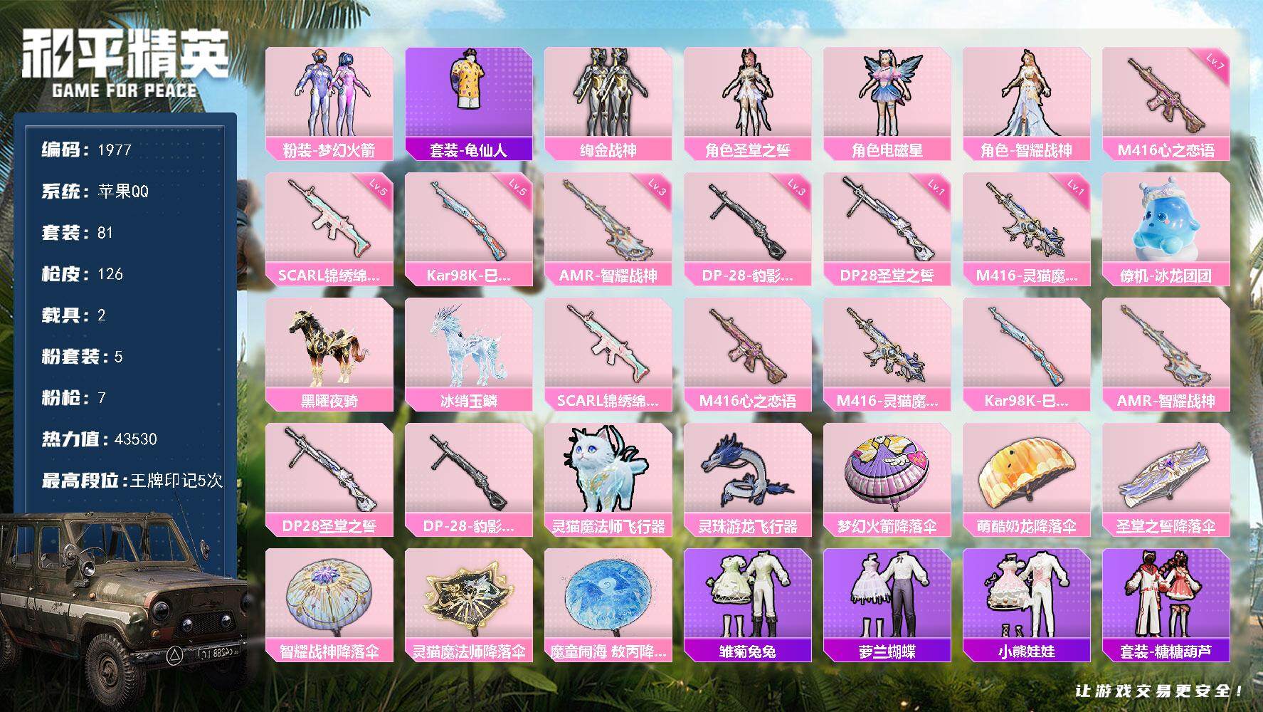 5粉装-7特效枪-2载具-2粉色飞行器-43530热力值-5王牌印记-81套装-126枪皮