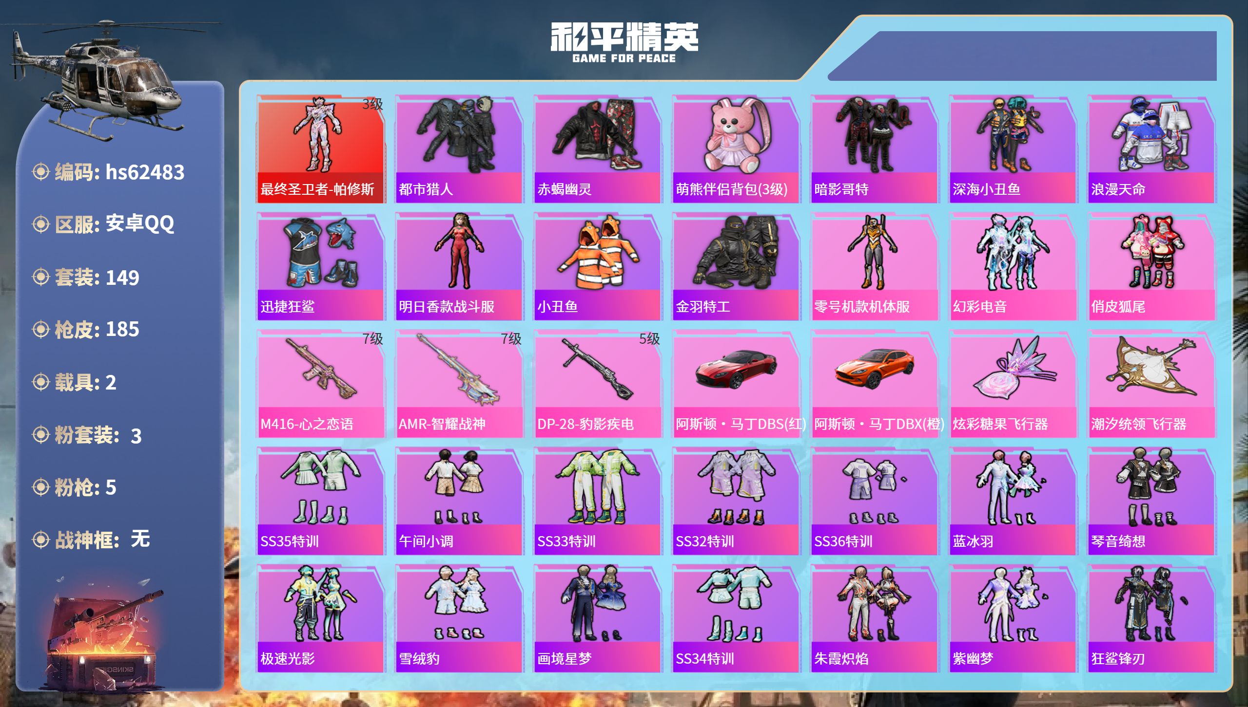 16粉装-6特效枪-0载具-3粉色飞行器-84503热力值-20王牌印记-191套装-249枪皮