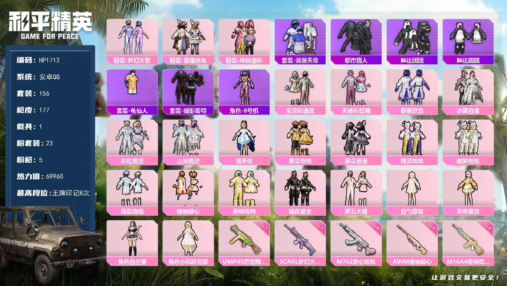 156套装/枪械5/装备256/载具1/战备155/王牌印记8/热力值69960/