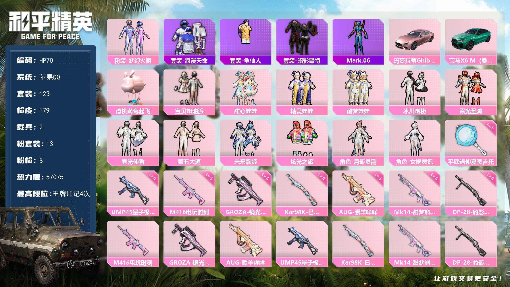 13粉装-8特效枪-2载具-1粉色飞行器-57075热力值-4王牌印记-123套装-179枪皮