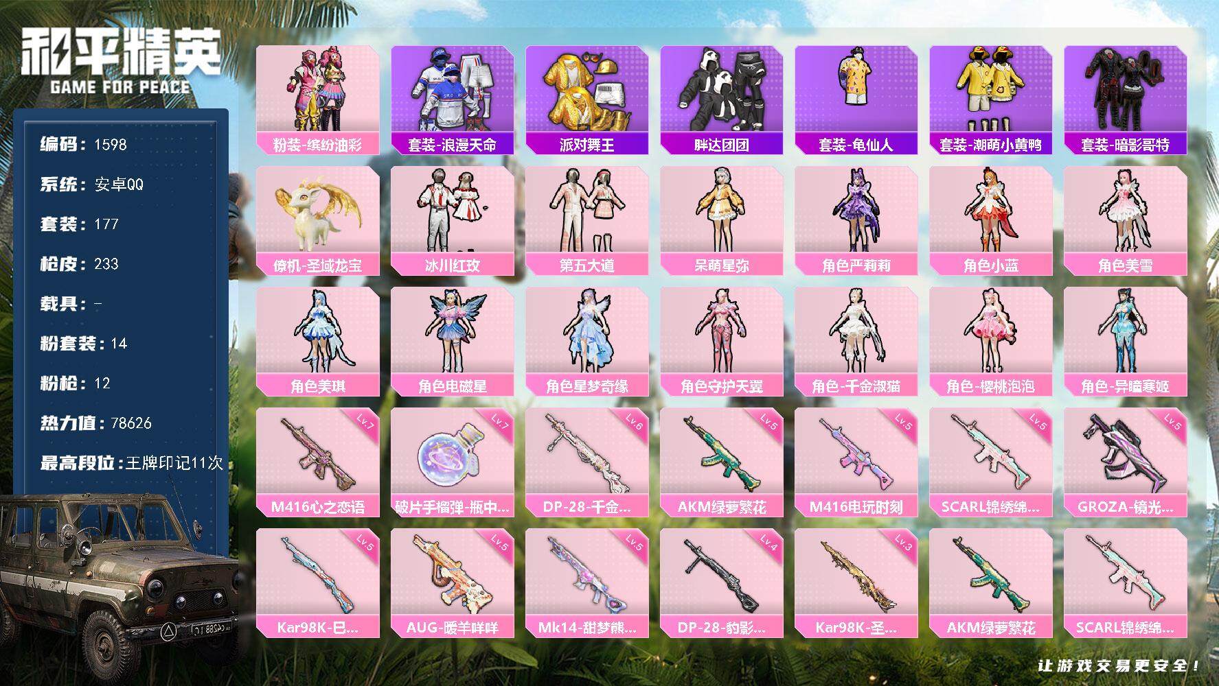 14粉装-12特效枪-0载具-4粉色飞行器-78626热力值-11王牌印记-177套装-233枪皮
