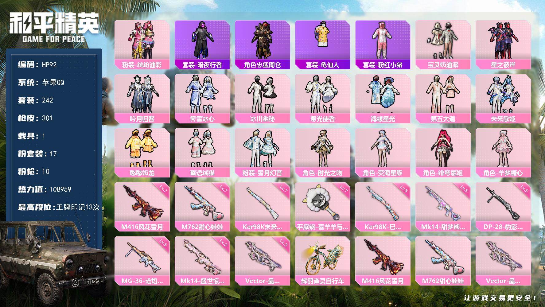 17粉装-10特效枪-1载具-8粉色飞行器-108959热力值-13王牌印记-242套装-301枪皮