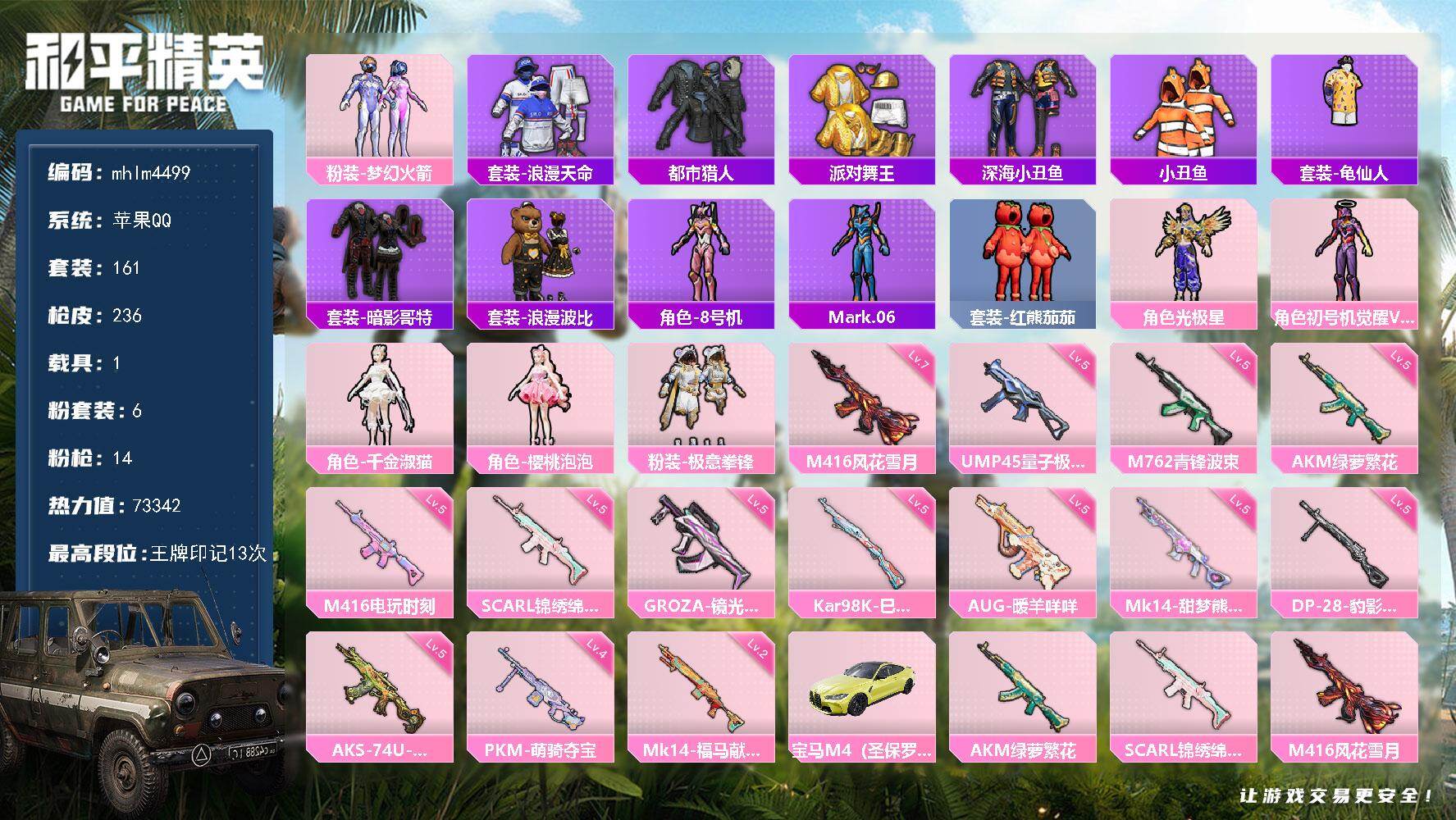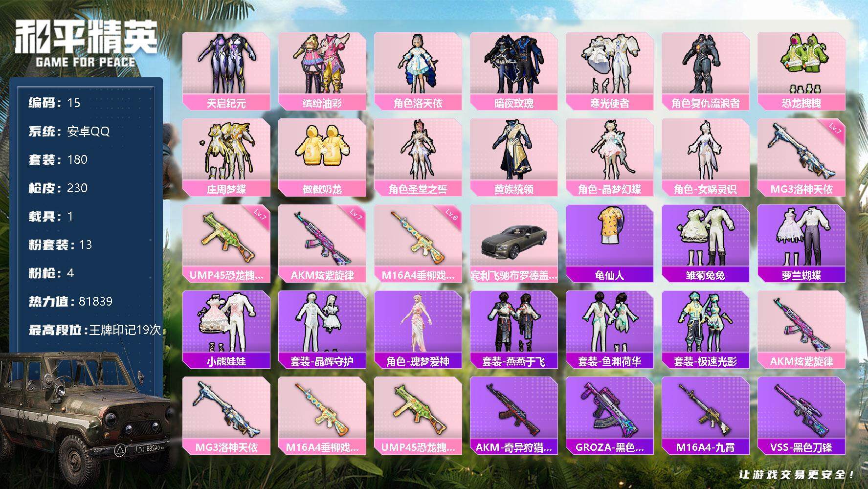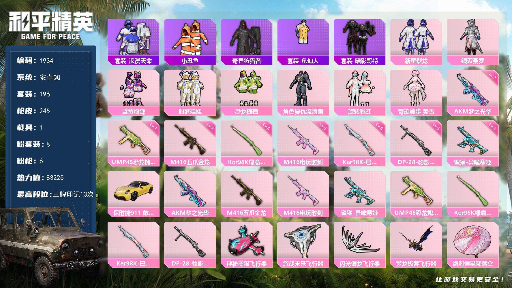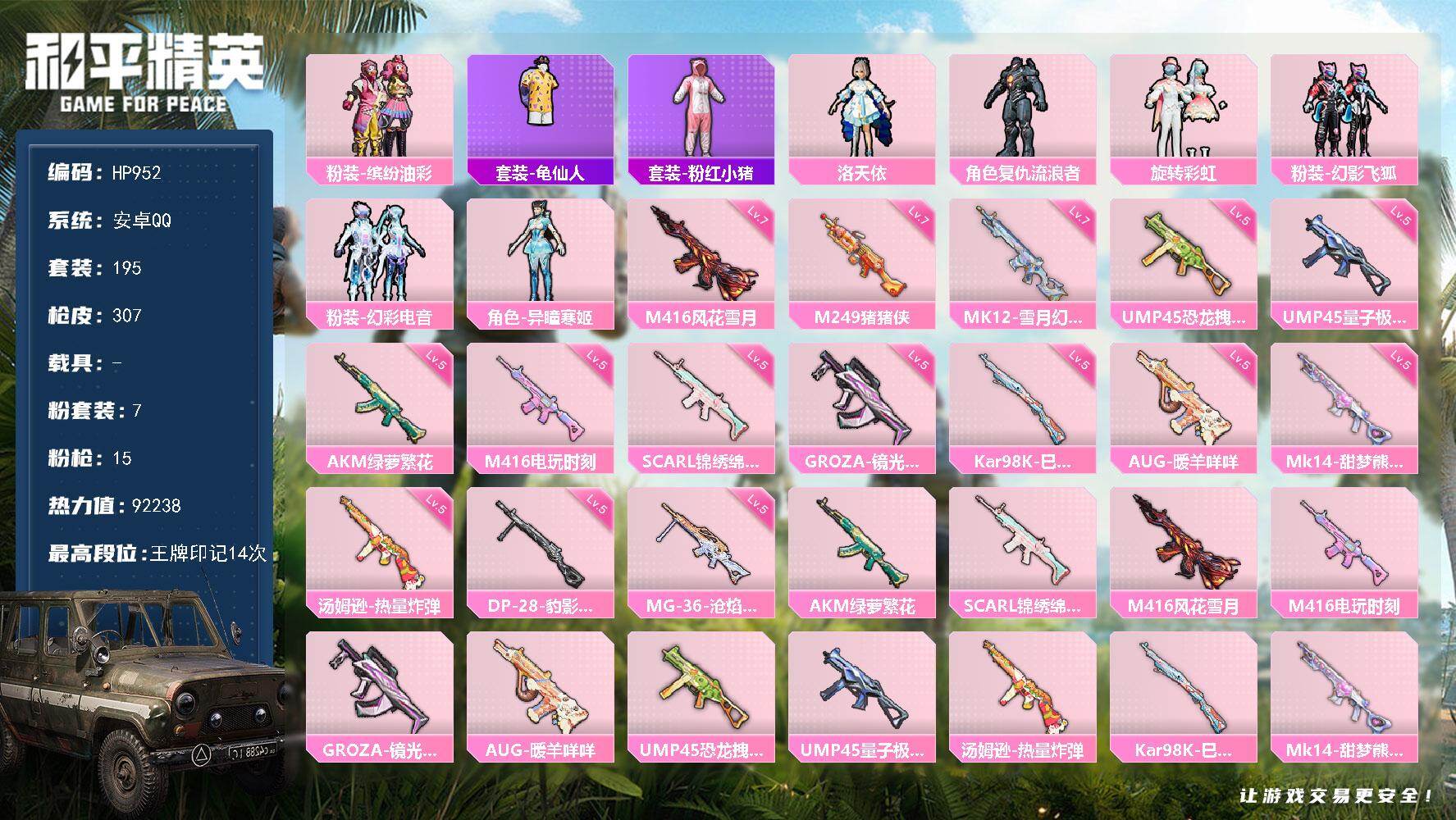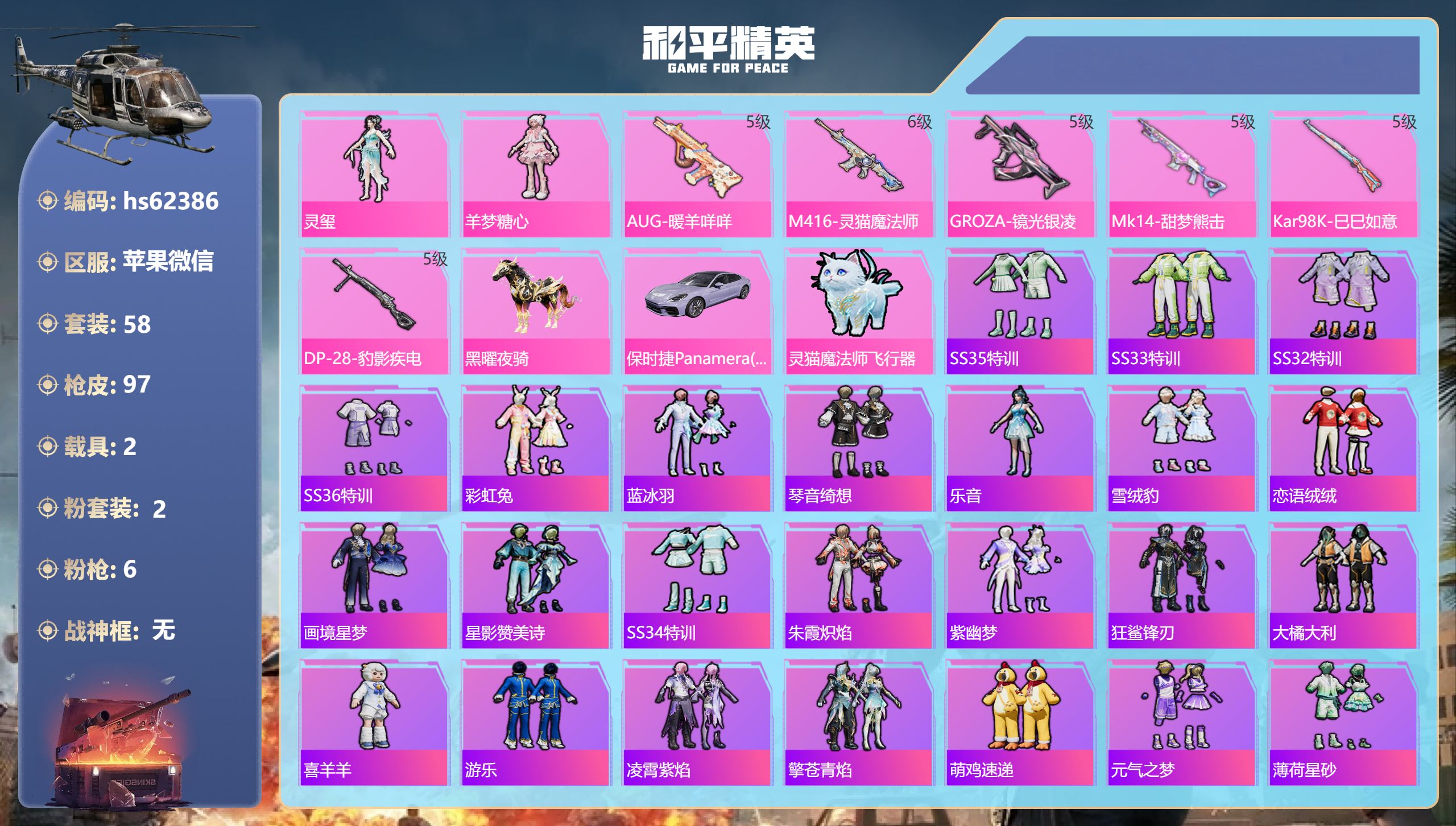 16粉装-2特效枪-0载具-2粉色飞行器-49650热力值-4王牌印记-145套装-147枪皮