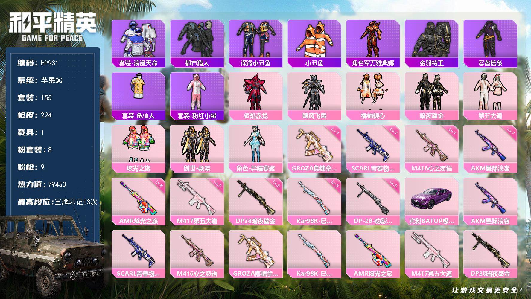 155套装/枪械9/装备302/载具1/战备156/王牌印记13/热力值79453/