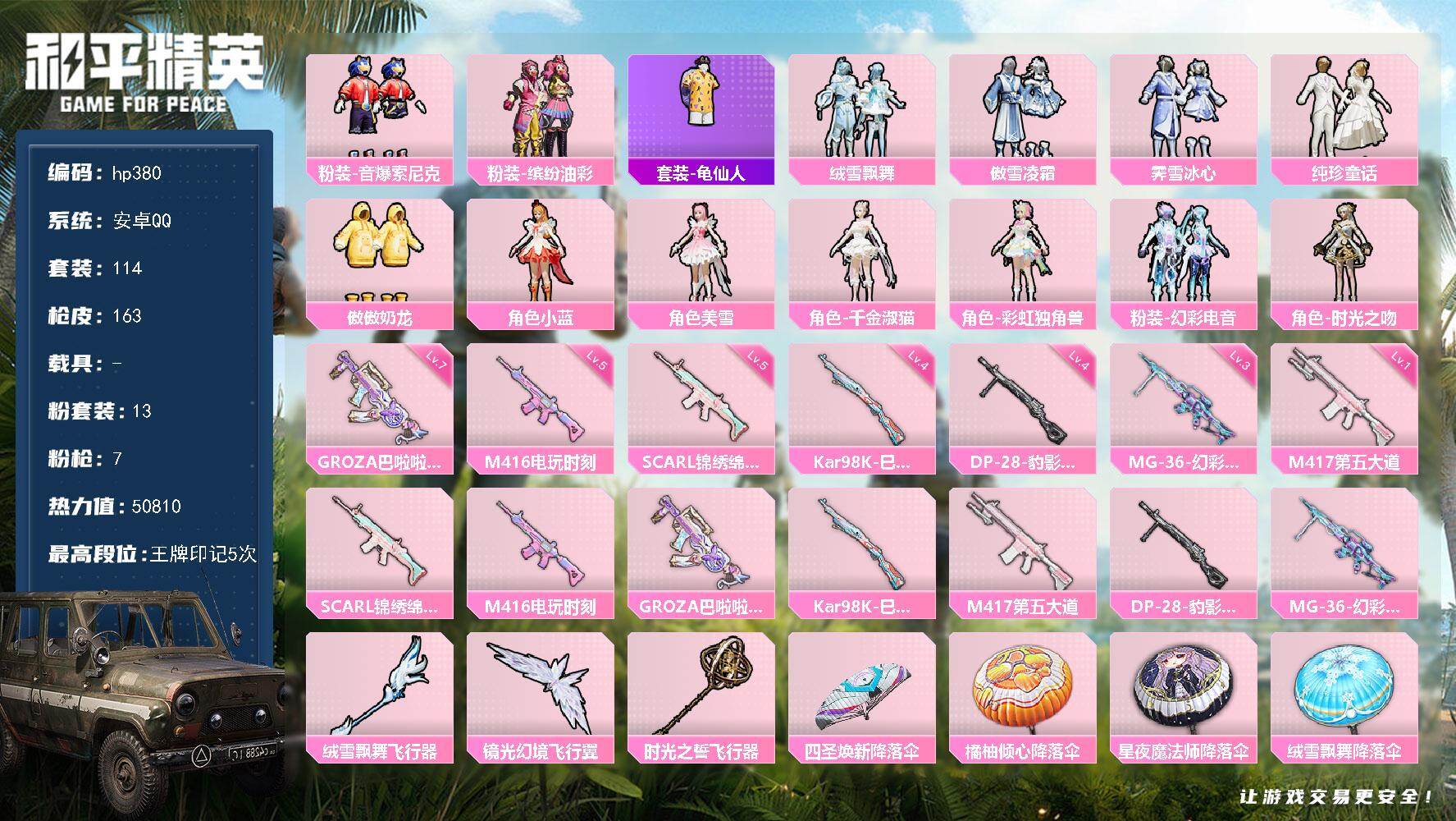 13粉装-7特效枪-0载具-3粉色飞行器-50810热力值-5王牌印记-114套装-163枪皮