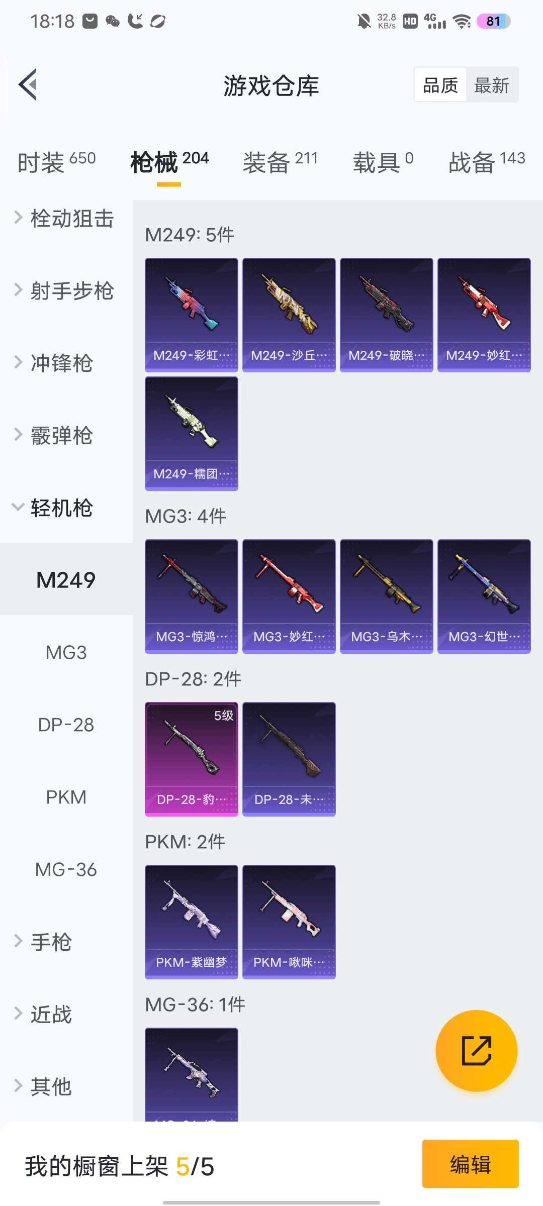 154套装/枪械7/装备277/载具1/战备130/王牌印记6/热力值71584/五级AKM-绿萝繁