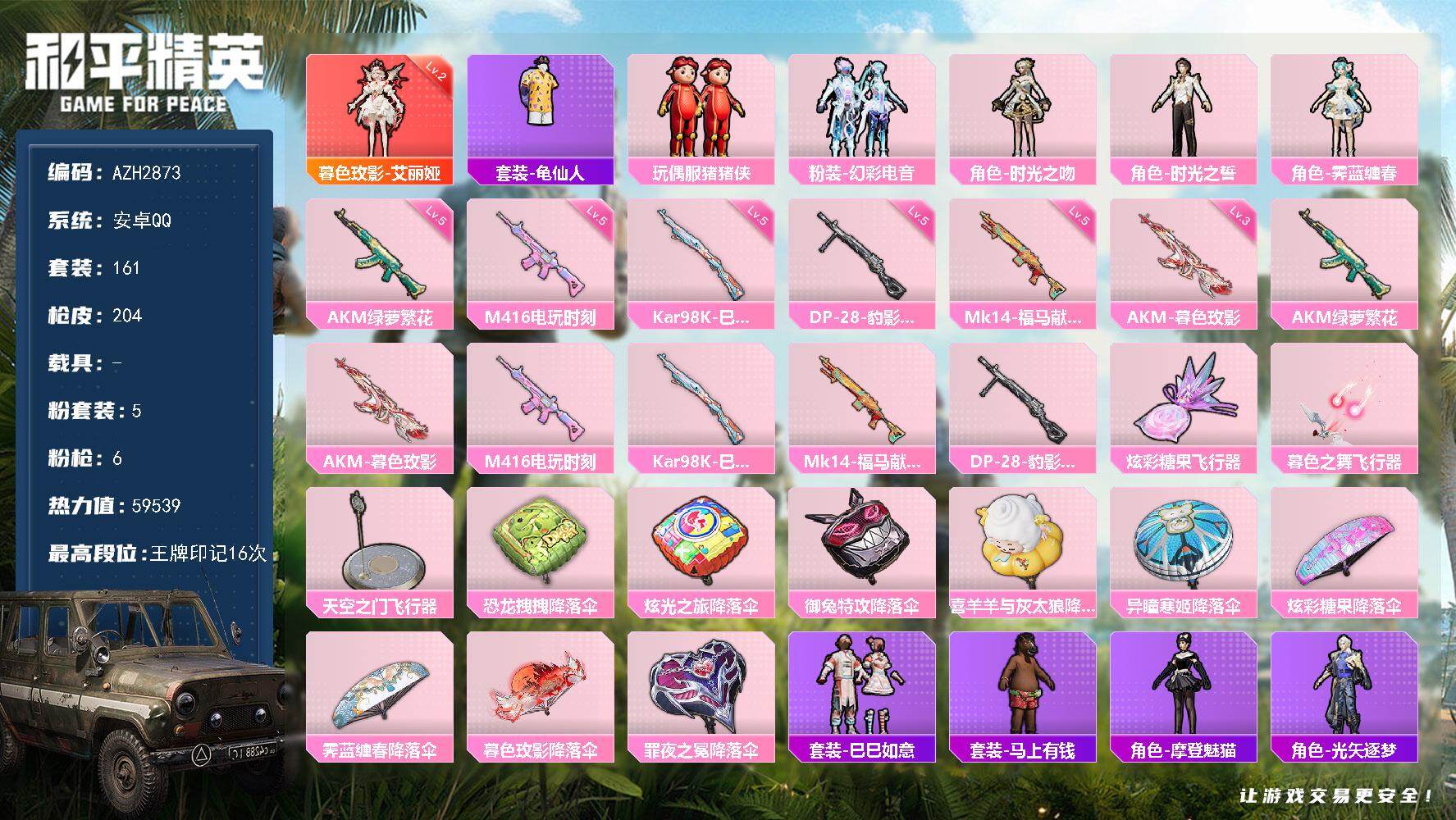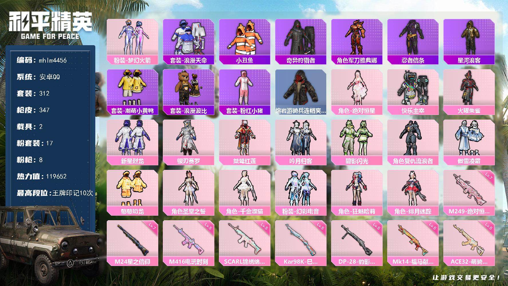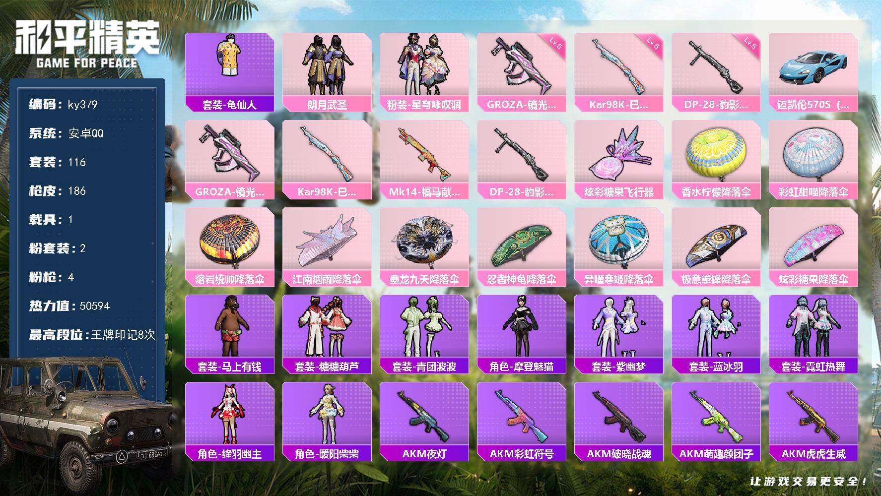 安卓 手Q-2粉装-4特效枪-1载具-1粉色飞行器-50594热力值-8王牌印