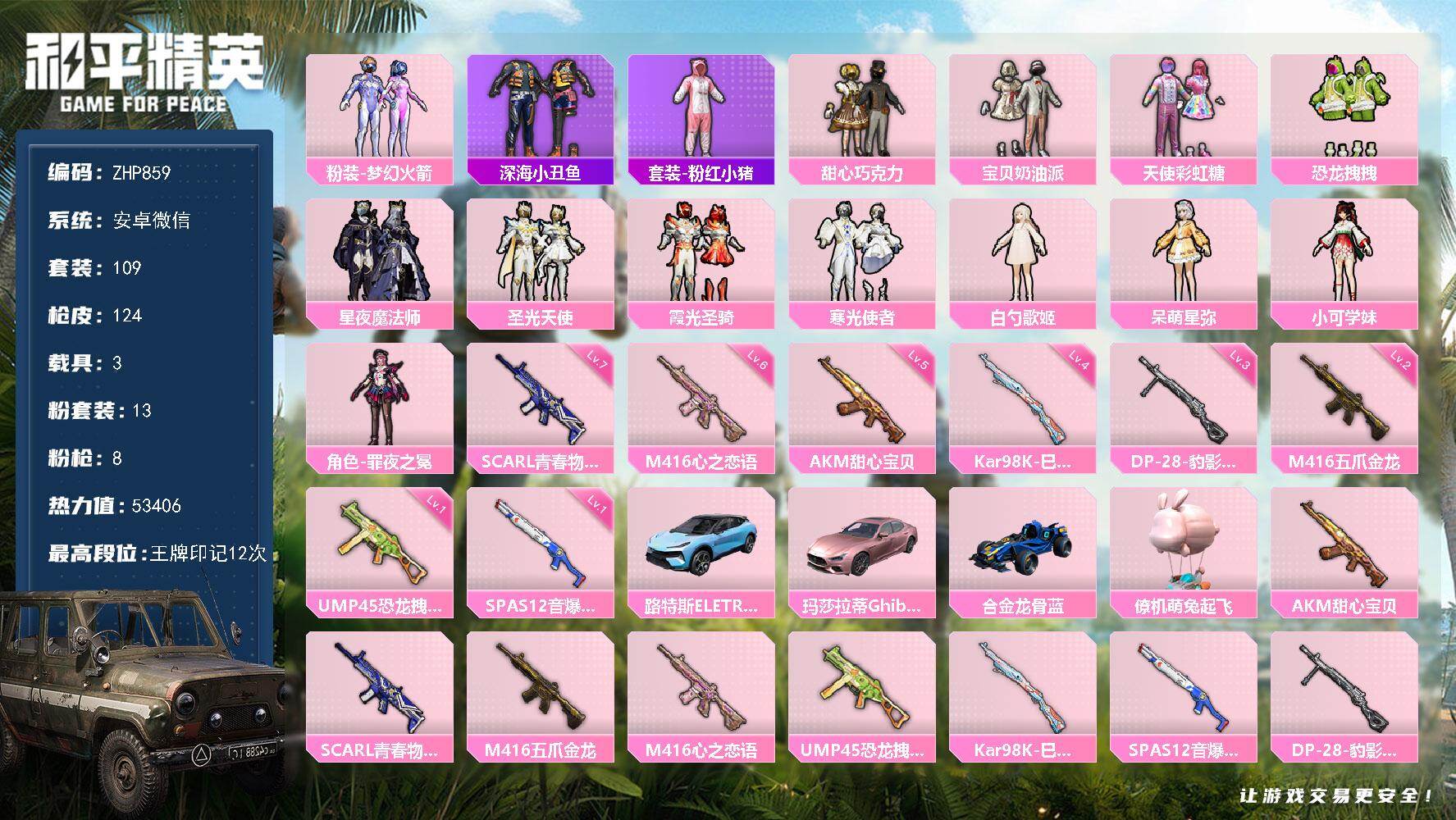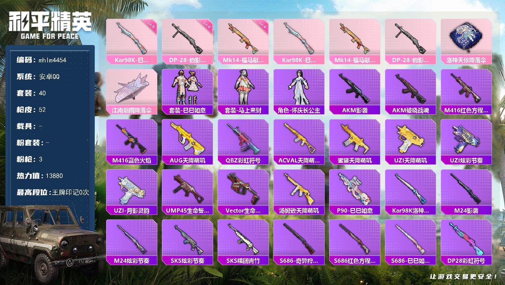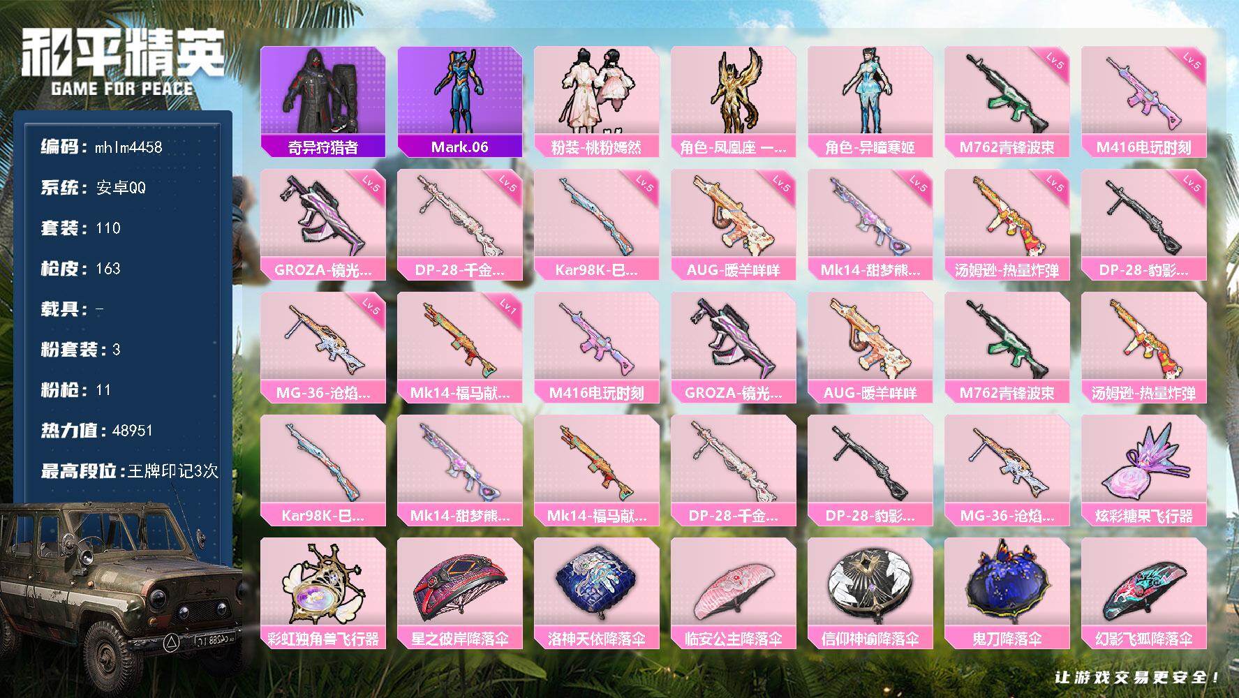 安卓 手Q-2粉装-4特效枪-1载具-1粉色飞行器-50594热力值-8王牌印
