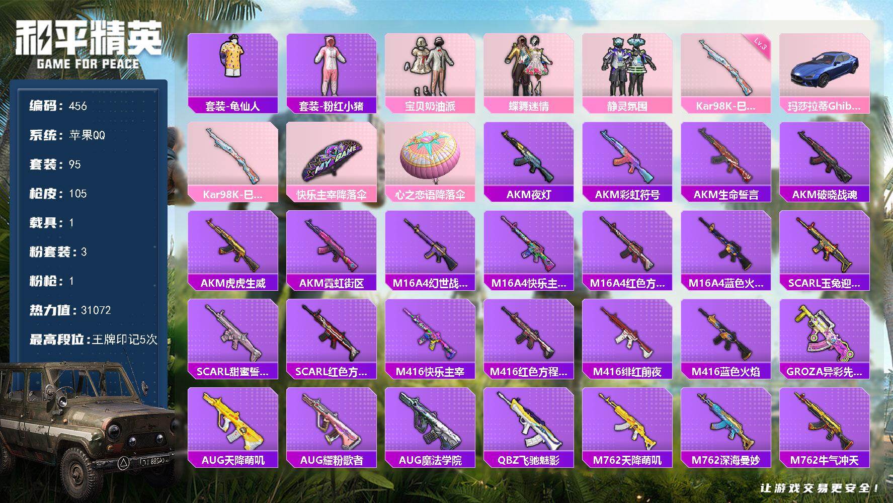 苹果 手Q-3粉装-1特效枪-1载具-0粉色飞行器-31072热力值-5王牌印