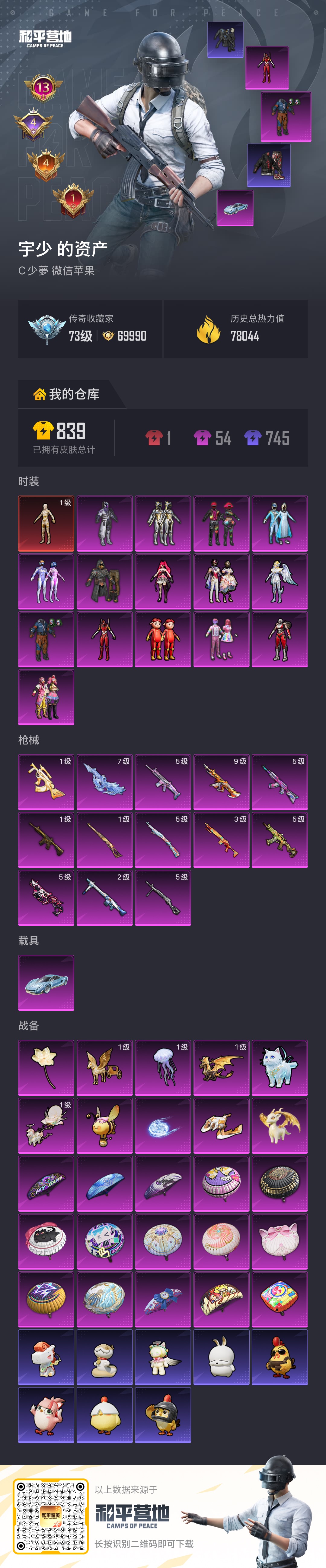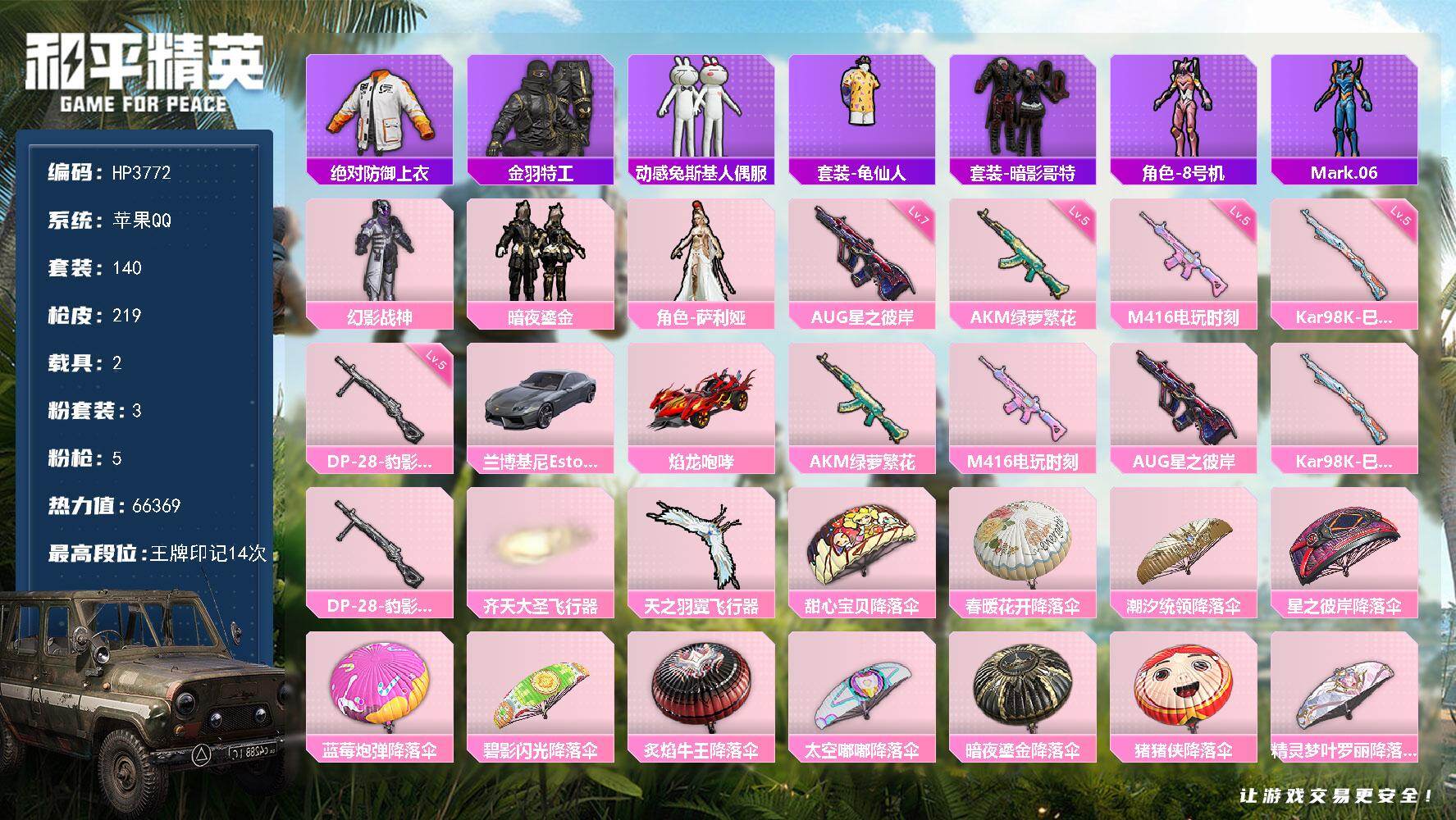 苹果 手Q-3粉装-5特效枪-2载具-2粉色飞行器-66369热力值-14王牌