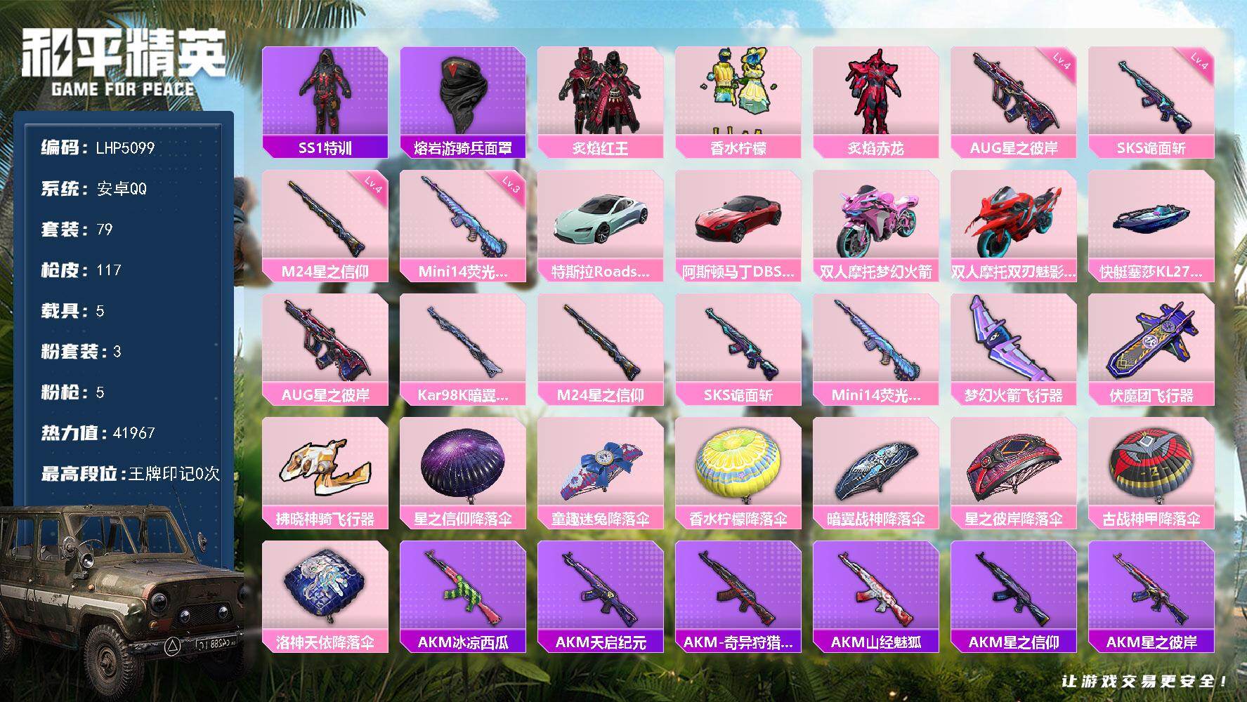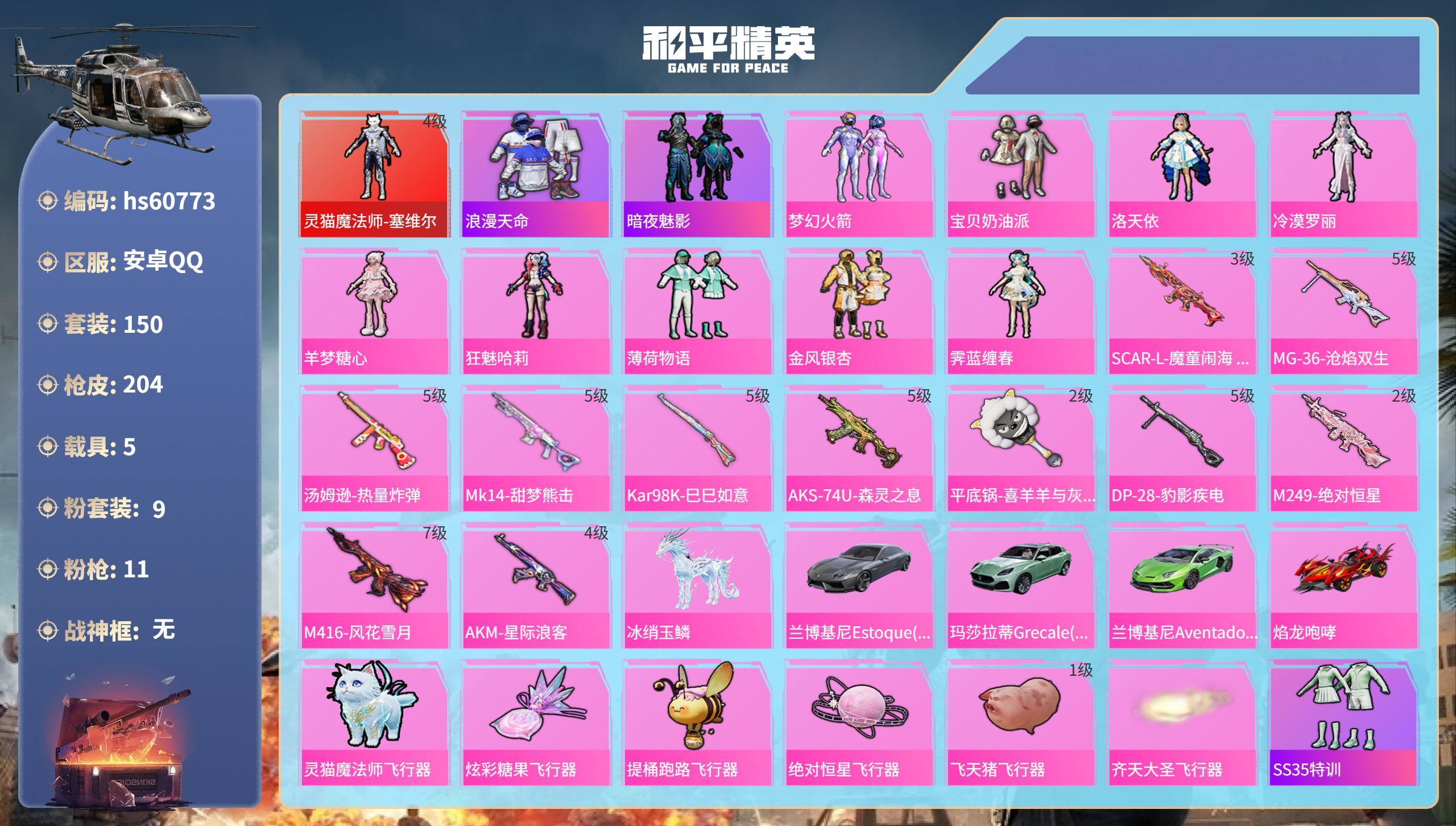 hs60773 安卓手Q-15王牌印记-1红装-9粉装-11特效枪-5载具-76034热力值-150