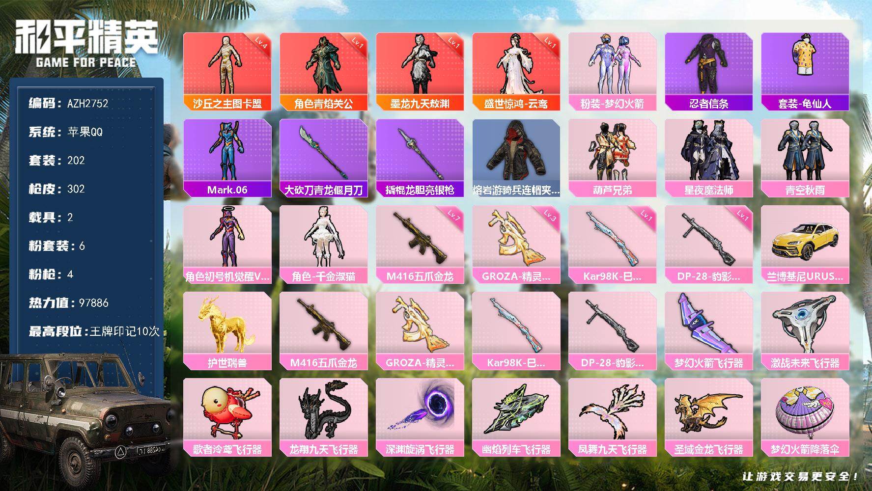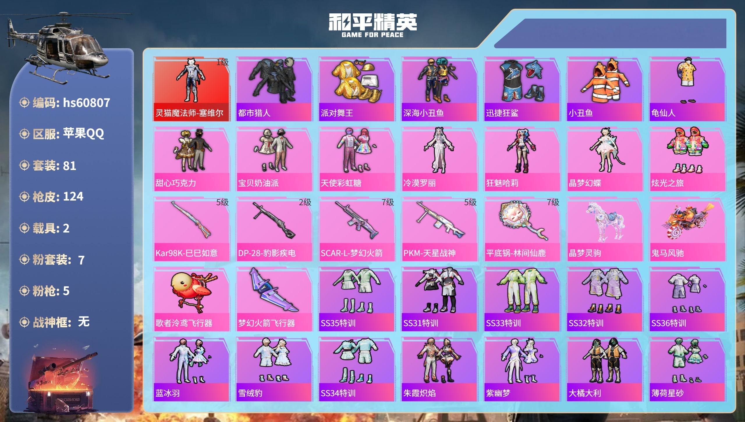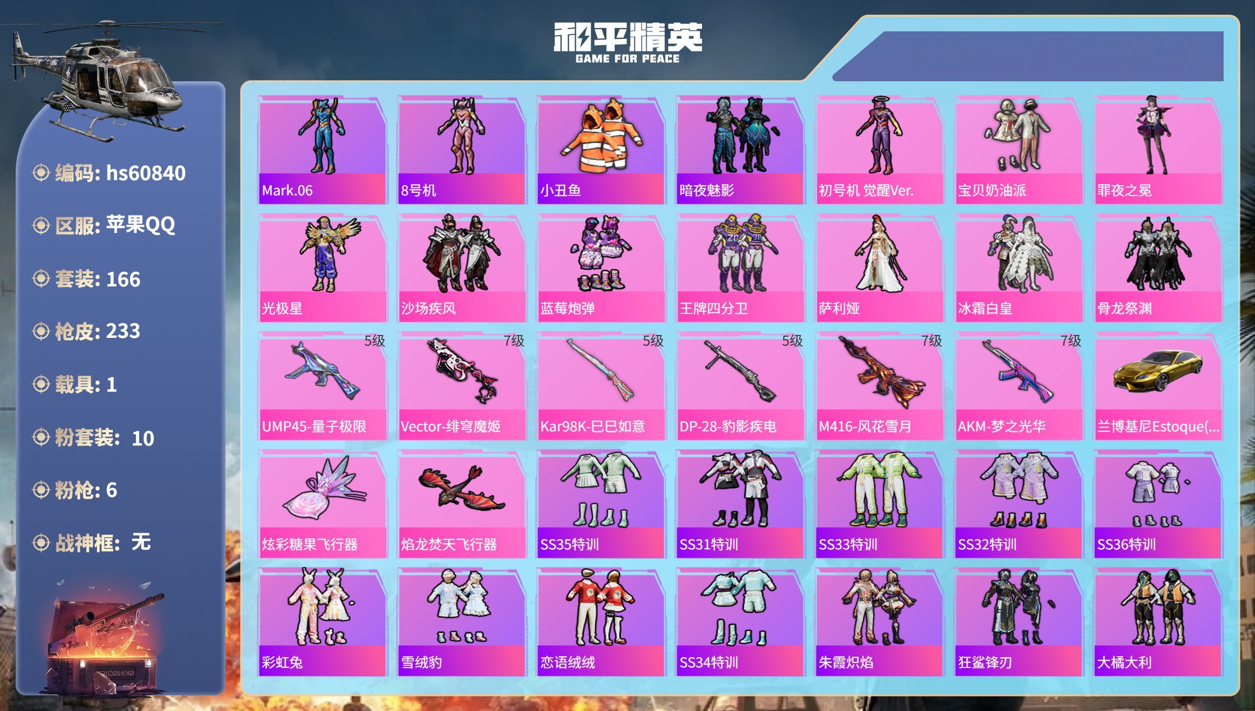 hs60840 苹果手Q-16王牌印记-10粉装-6特效枪-1载具-77885热力值-166套装-2